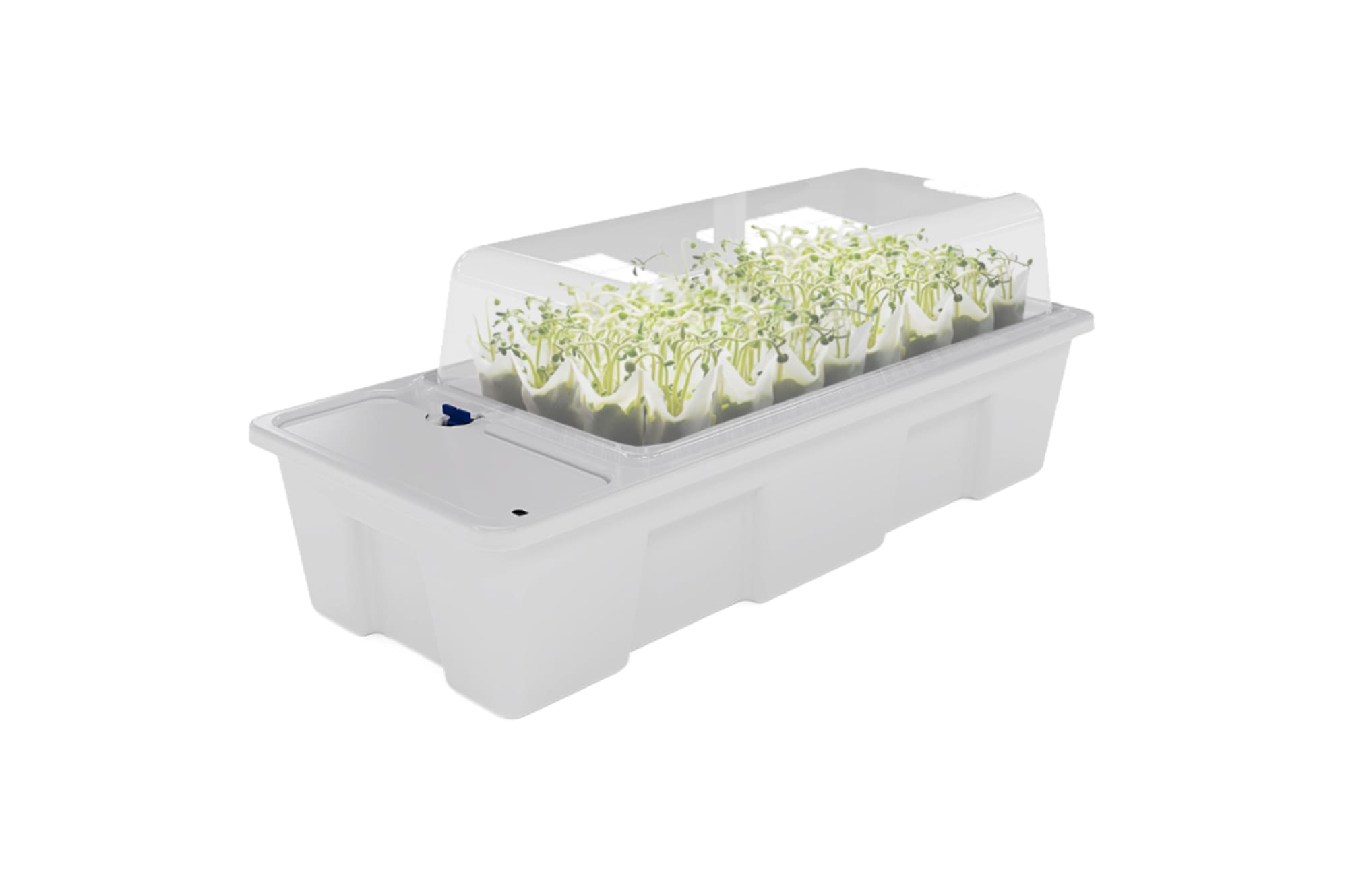 «Восход» прост в использовании и готов к работе сразу после установки. В комплекте есть всё необходимое: бак, крышка, прозрачный колпак, помпа, магистраль полива и система слива. Колпак сохраняет стабильную влажность и защищает ростки, а крышка выдерживает до 5 килограммов нагрузки, позволяя ставить горшки с рассадой.