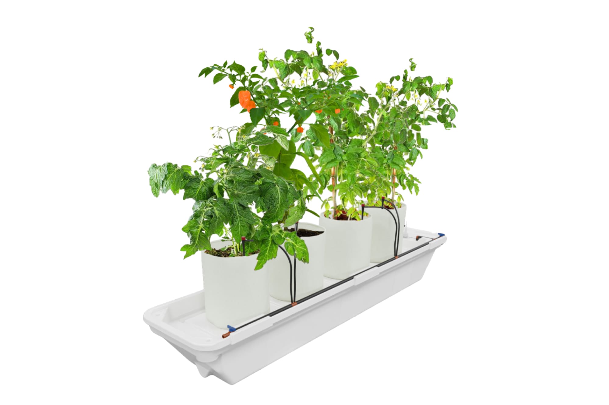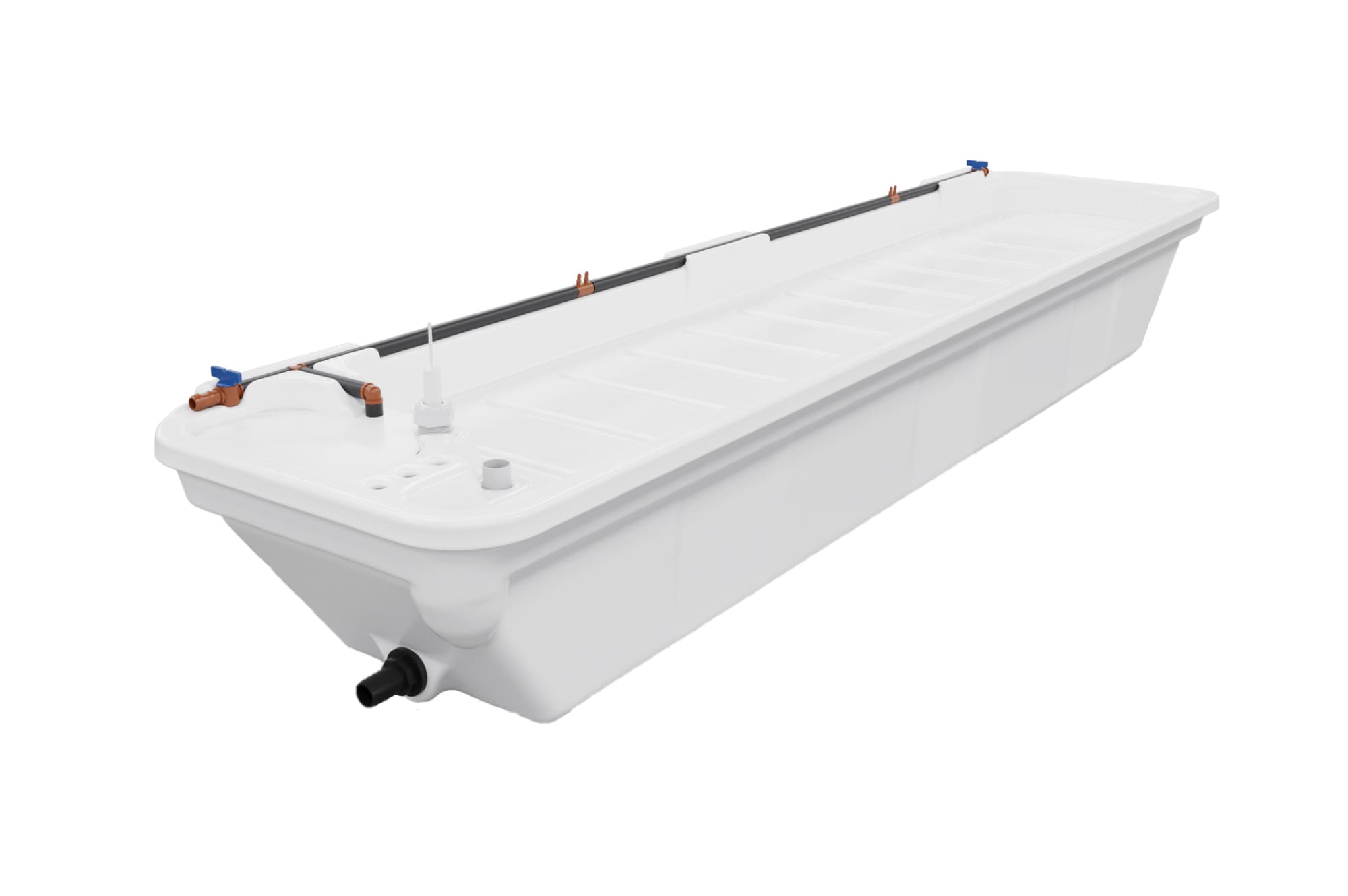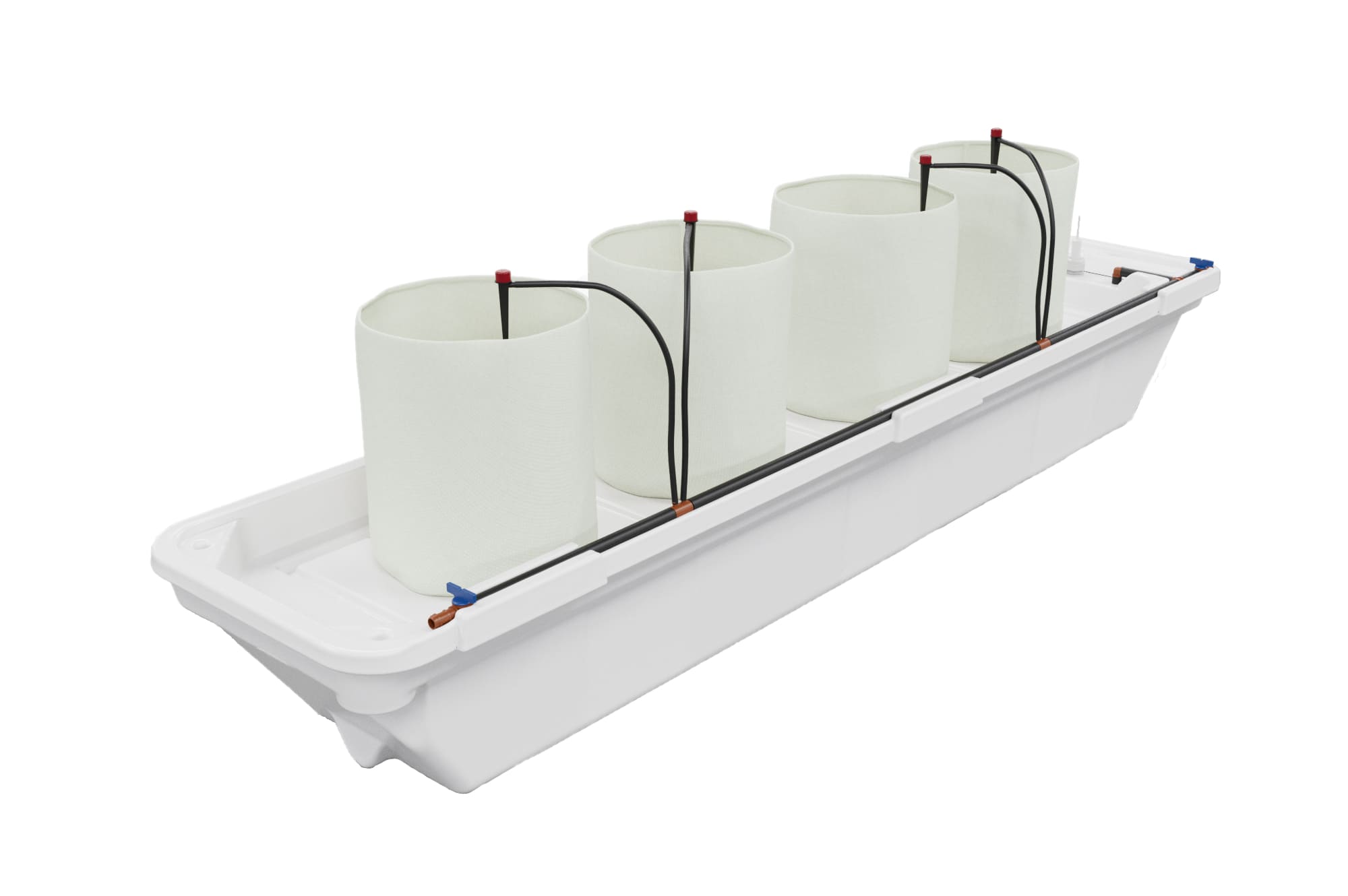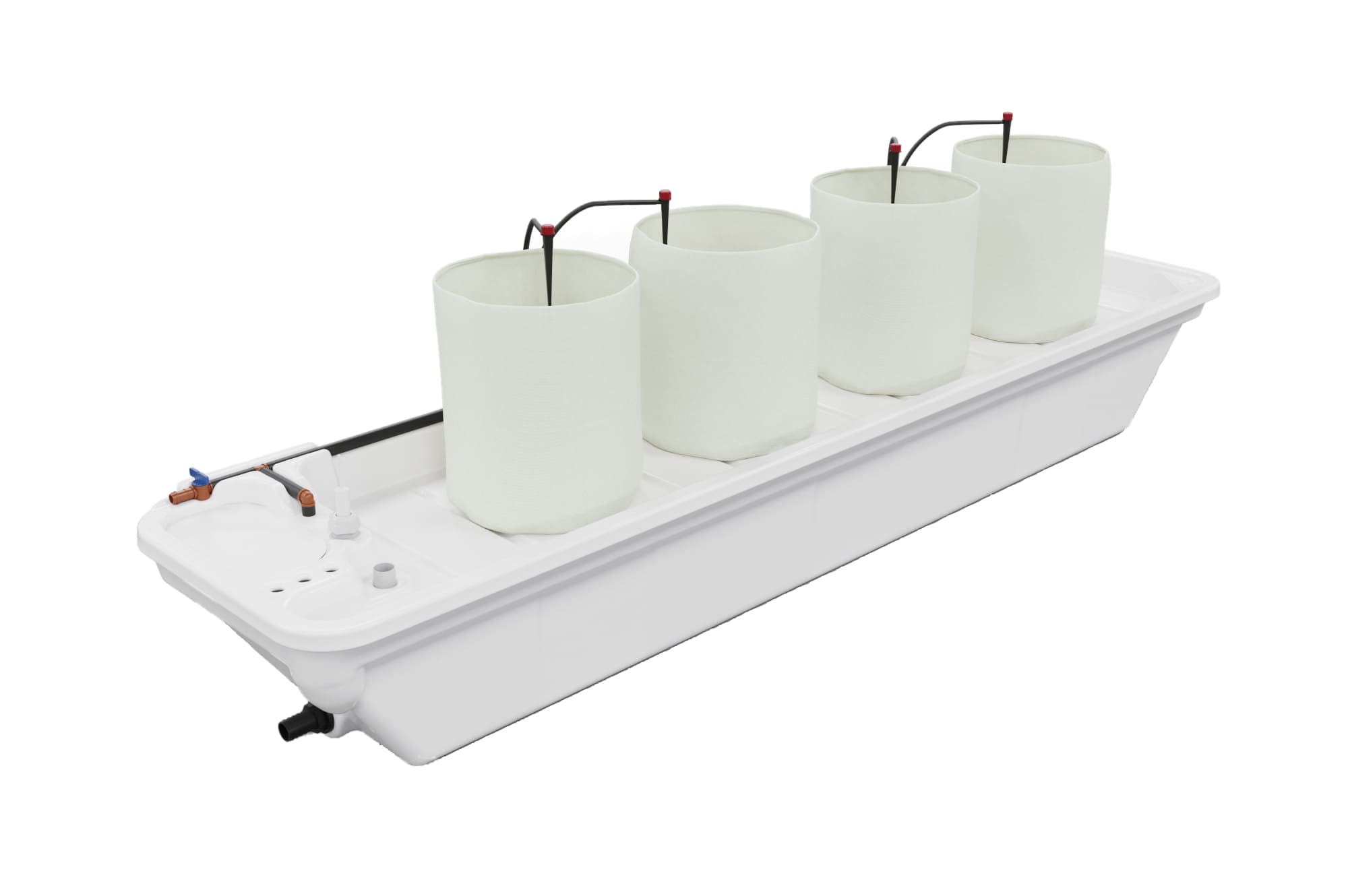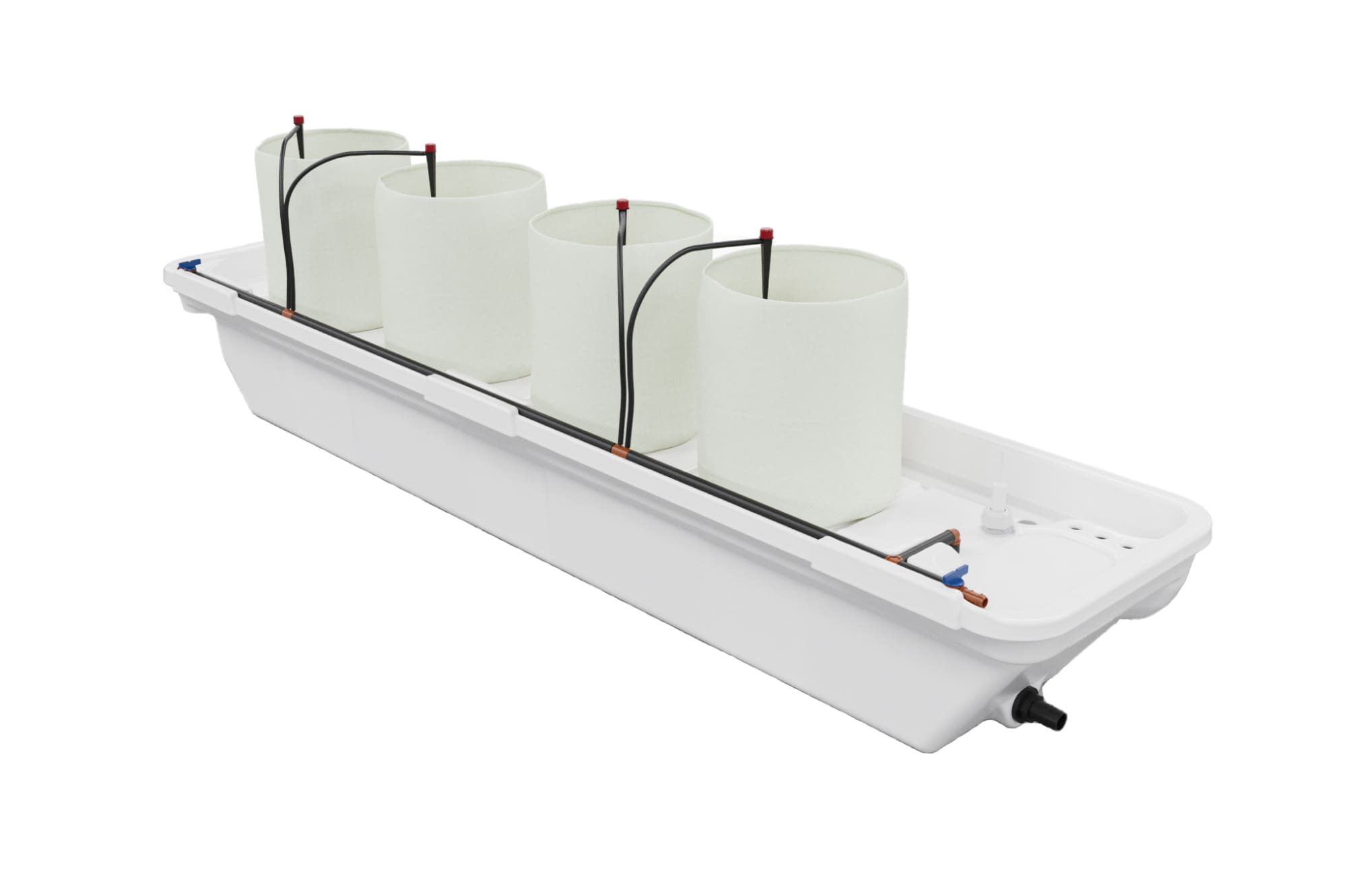 Система включает все необходимые компоненты: магистраль полива, сливной шланг, фильтр и клапаны. Для автоматизации полива можно подключить устройство Ponics Pilot, которое позволяет удалённо контролировать параметры раствора и управлять системой.