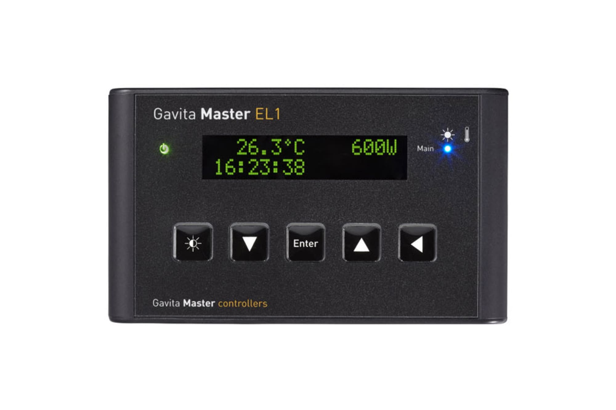 Приборы подключаются к контроллеру через телефонный штекер отдельно от электросети. Gavita Master EL 1 EU может отключать подсоединённые устройства, менять мощность питания, настраивать интенсивность освещения. Есть возможность свето-климатической имитации заката и восхода. Модель оснащена калибруемым датчиком температуры. Текущие рабочие параметры отображаются на дисплее (мощность – в Вт или %).
