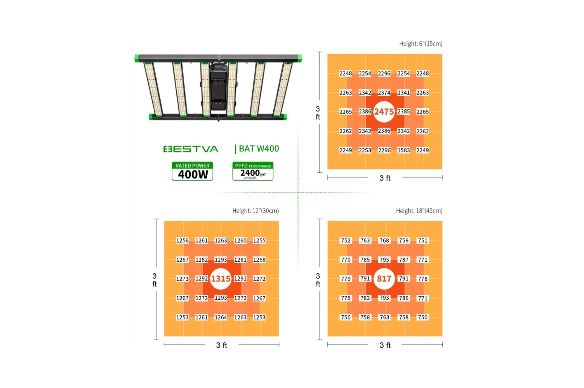 BESTVA Bat W400 может использоваться как в любительском, так и в профессиональном растениеводстве. Эффективная площадь освещения одной панели составляет 122х122 см. Также модель предполагает возможность работы в составе параллельной цепи из нескольких однотипных устройств. Максимальное число светильников BESTVA Bat W400, которые можно соединить друг с другом, — 80. При этом управление всей цепочкой возможно с одного контроллера. Также предусмотрен удаленный контроль за работой оборудования через специальное мобильное приложение.