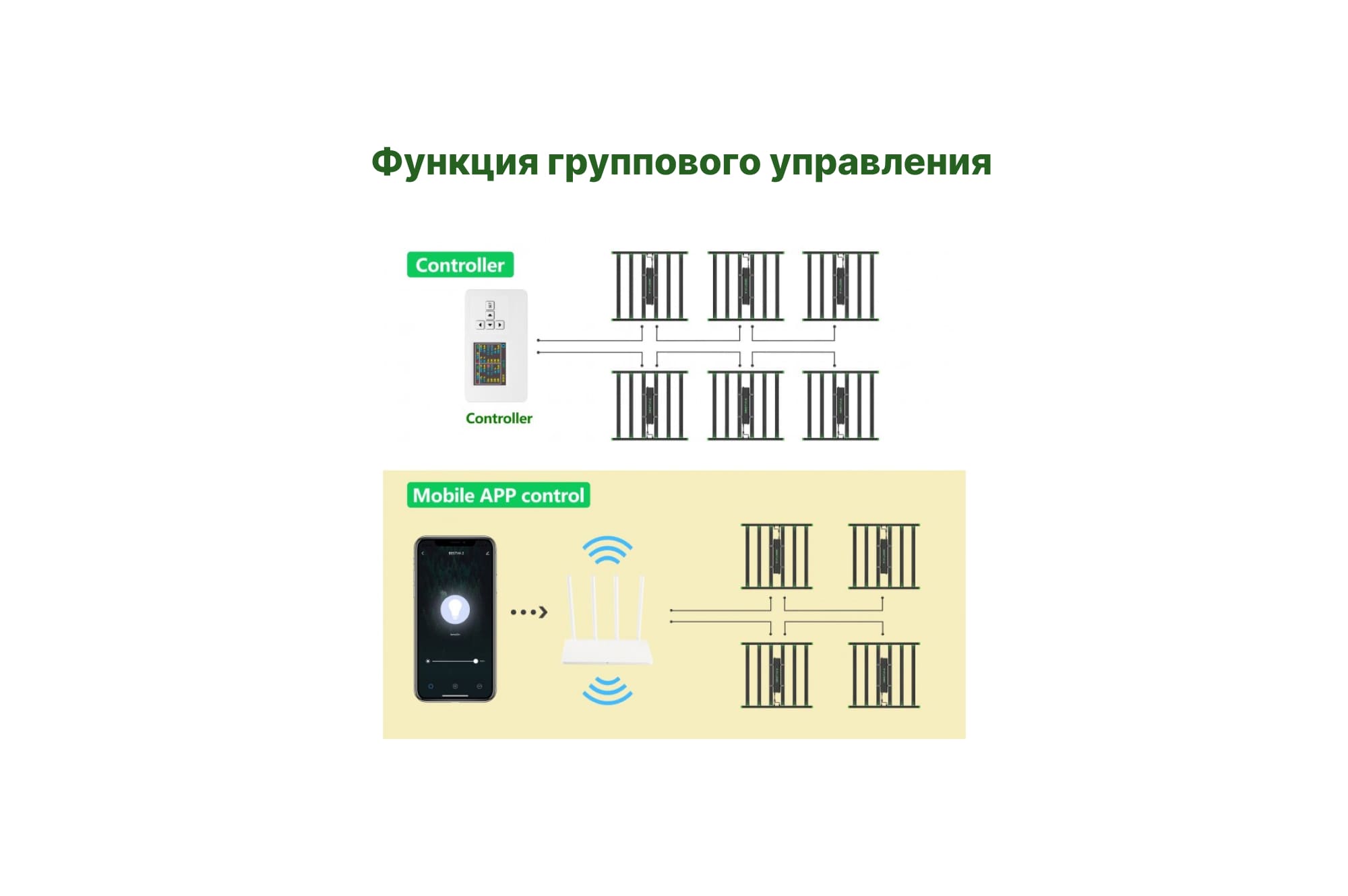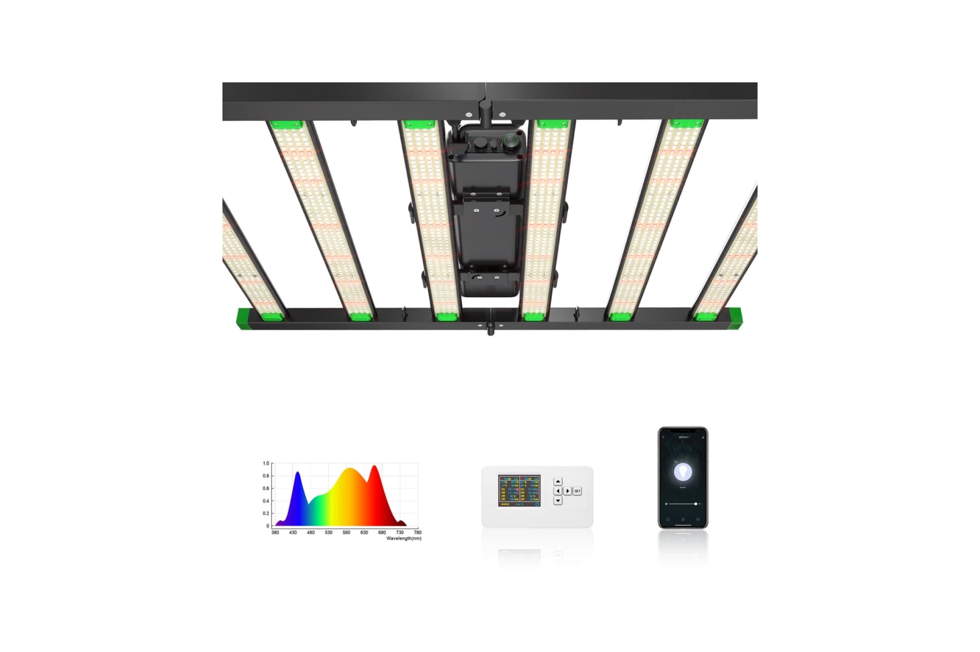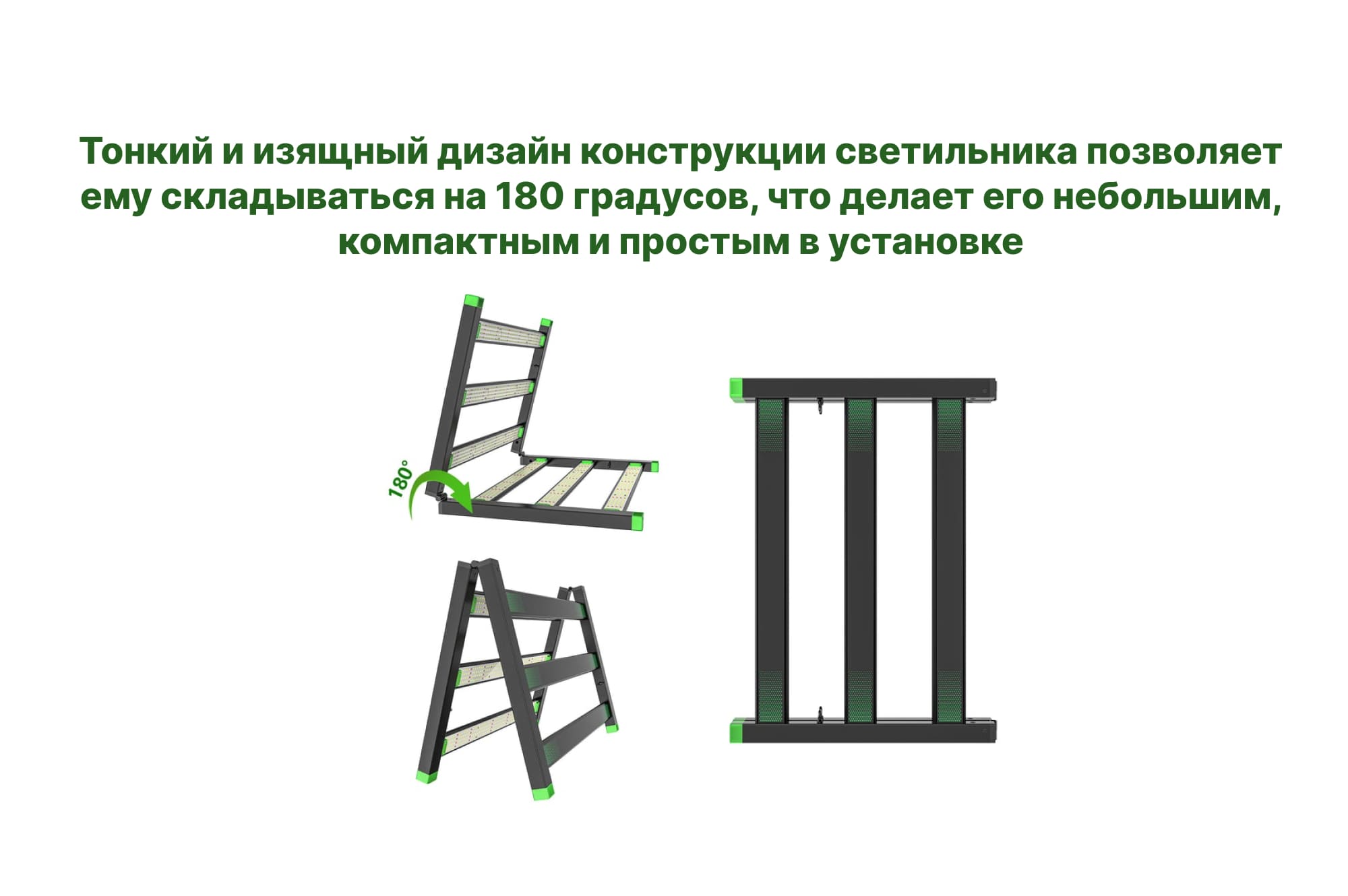 Фитолампа представляет собой светодиодный светильник реечного типа, включающий 6 световых планок. Панель укомплектована диодами типа LM301B, производимыми фирмой Samsung. Суммарное число светодиодов — 448. Среди них — инфракрасные, белые и красные диоды. Диапазон освещения лампы — 500-599 нм. Спектр сочетает в себе участки красного и синего света и обеспечивает активный фотосинтез. Эффективность лампы составляет 2.9 мкмоль/Дж. Излучение максимально приближено к солнечному свету и комфортно для растений и человека.