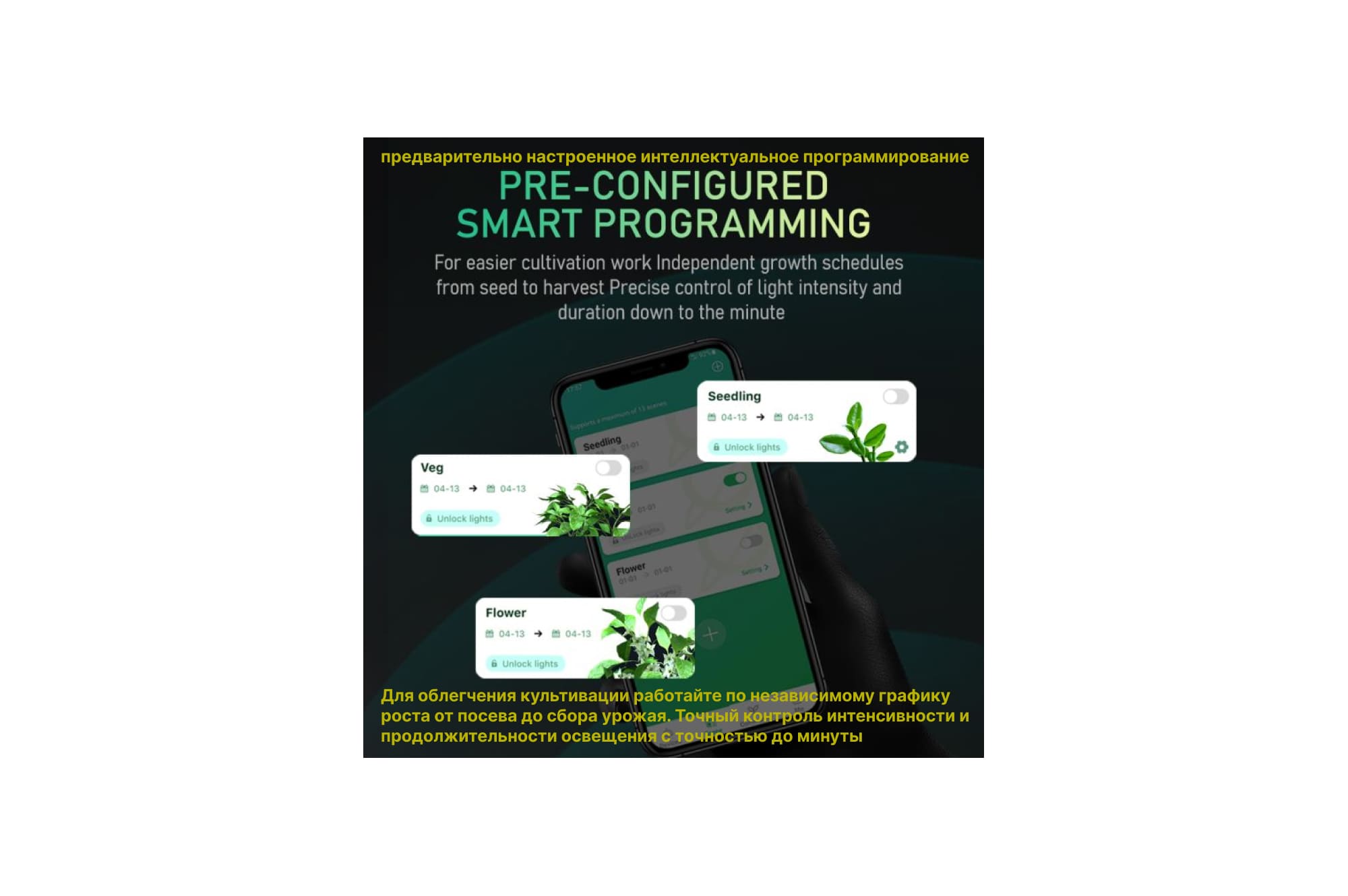 Одной из отличительных особенностей FC 4800-EVO является её интеллектуальная система управления. Функционал управления через приложение на смартфоне и WiFi включает в себя планирование роста, автоматическое затемнение, таймер и программирование плана выращивания. Такие возможности предоставляют садоводам инструменты для более точного и удобного управления процессом культивирования.