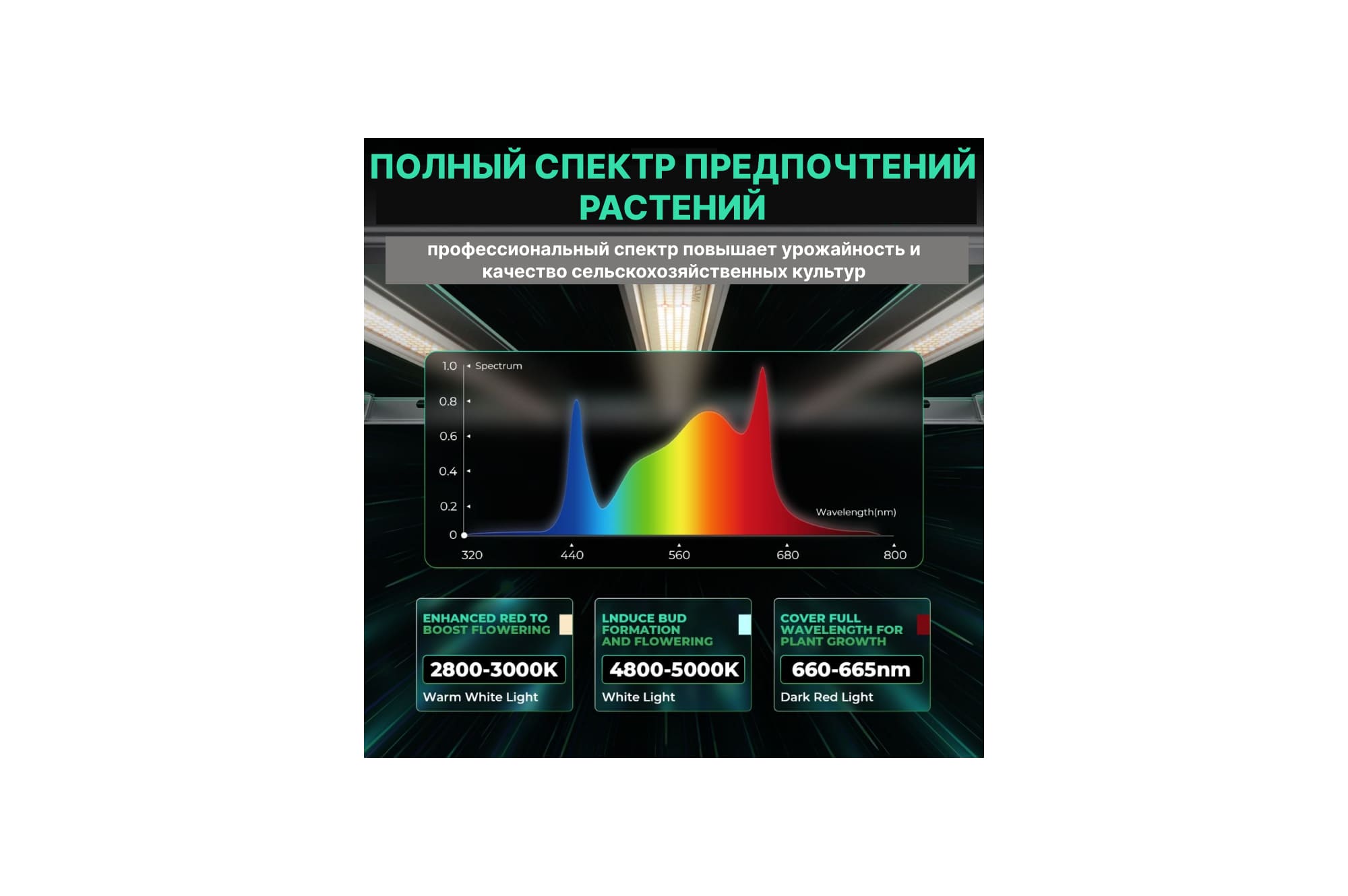 Полный спектр освещения, включающий диапазоны 2800K-3000K, 660-665 нм и 4800K-5000K, способствует оптимальному фотосинтезу и здоровому развитию растений на всех стадиях роста.