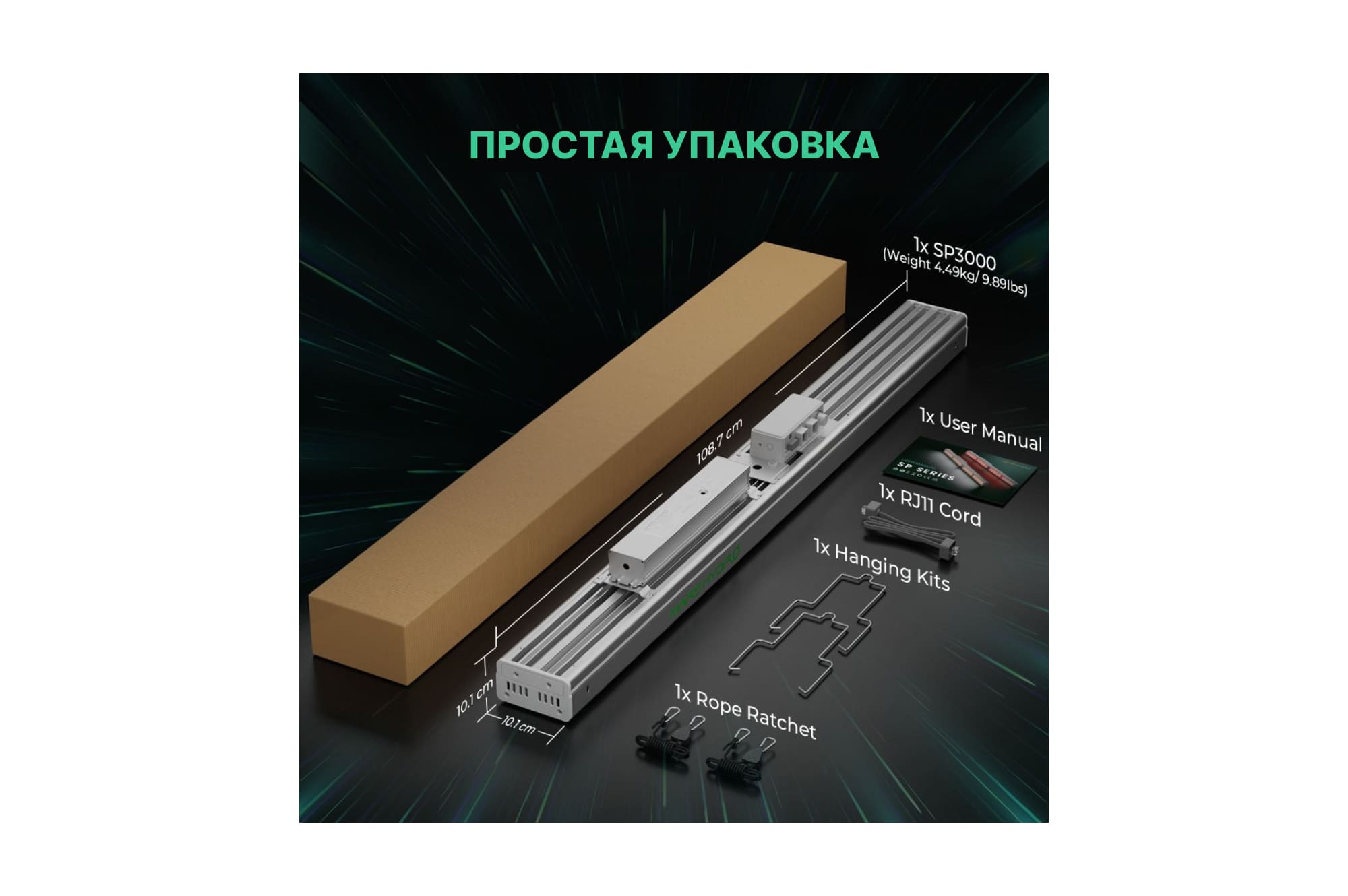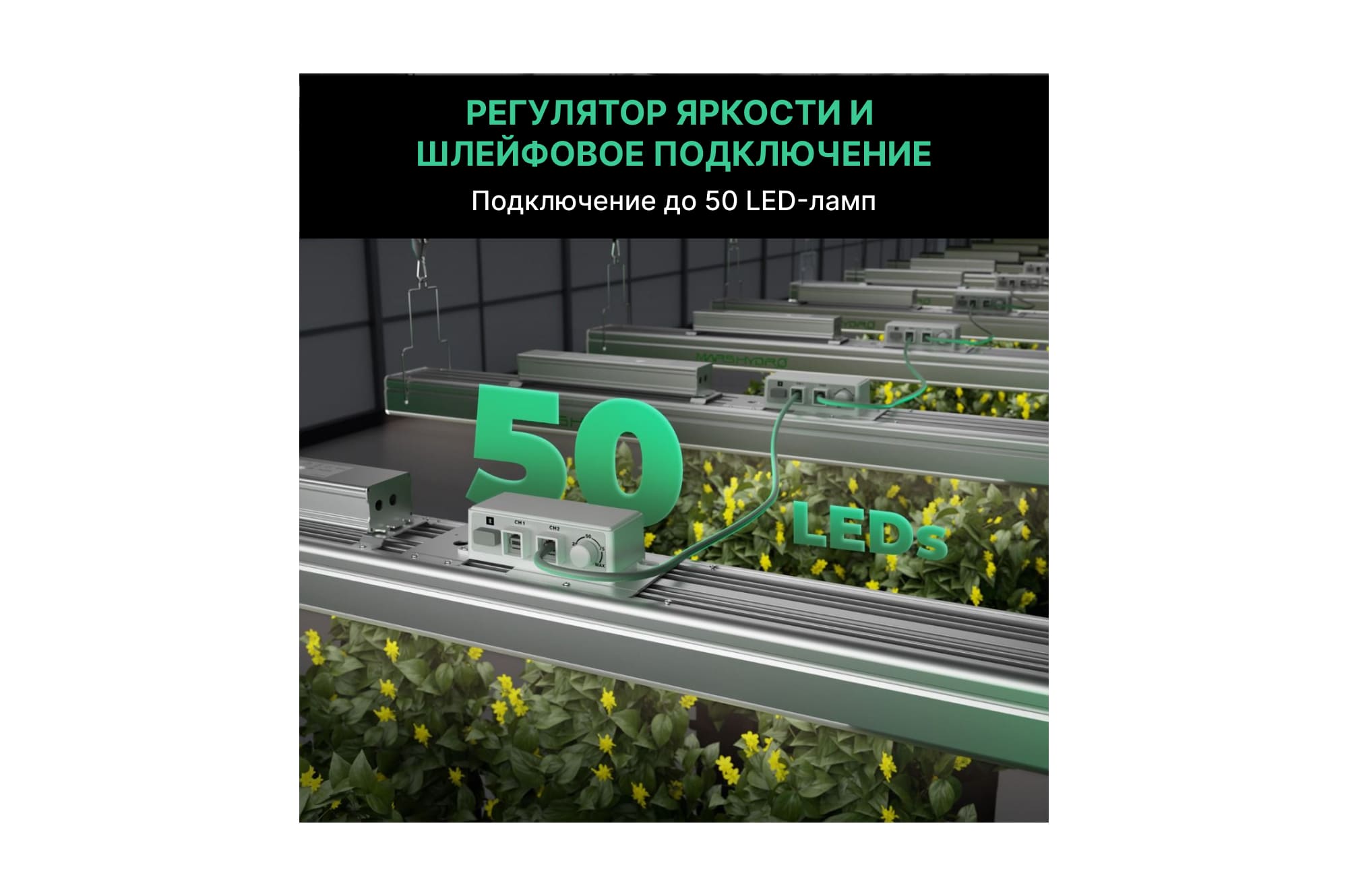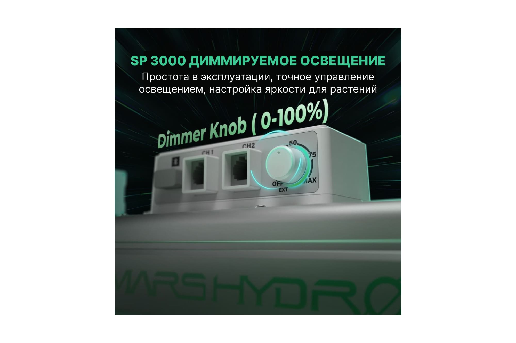 Монтируется Mars Hydro SP 3000 на подвесах и подключается через съемный драйвер Mean Well. Интенсивность яркости светового потока легко регулируется диммером с кольцевой шкалой.