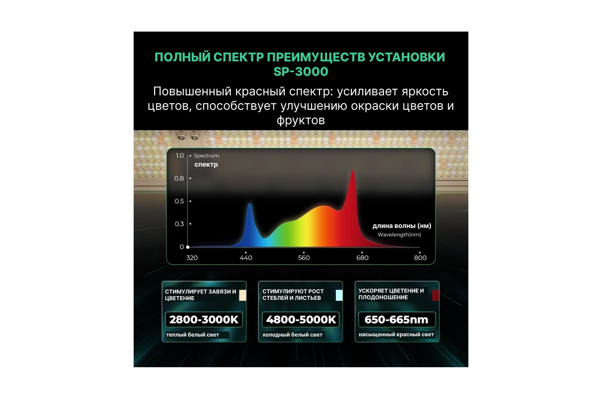 Mars Hydro SP 3000 укомплектован светодиодам Samsung LM301B и Osram 660 и генерирует световое излучение специального фитоспектра Sunlike Full Spectrum, для которого характерен высокий коэффициент красного спектра и повышенное количество теплого белого света (650…660 нм, 2800…3200 К, 4800…5000 К). Такое освещение:
