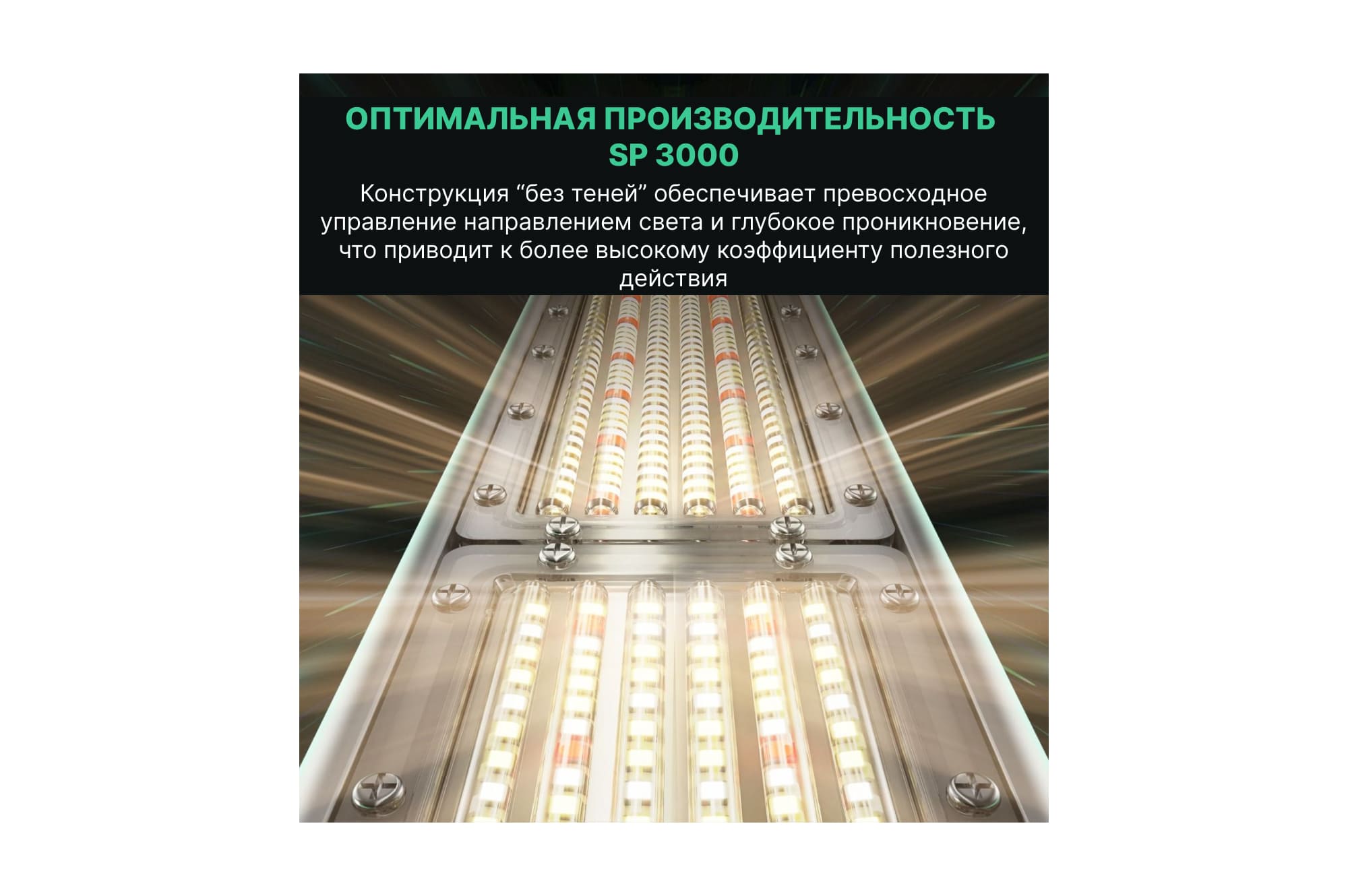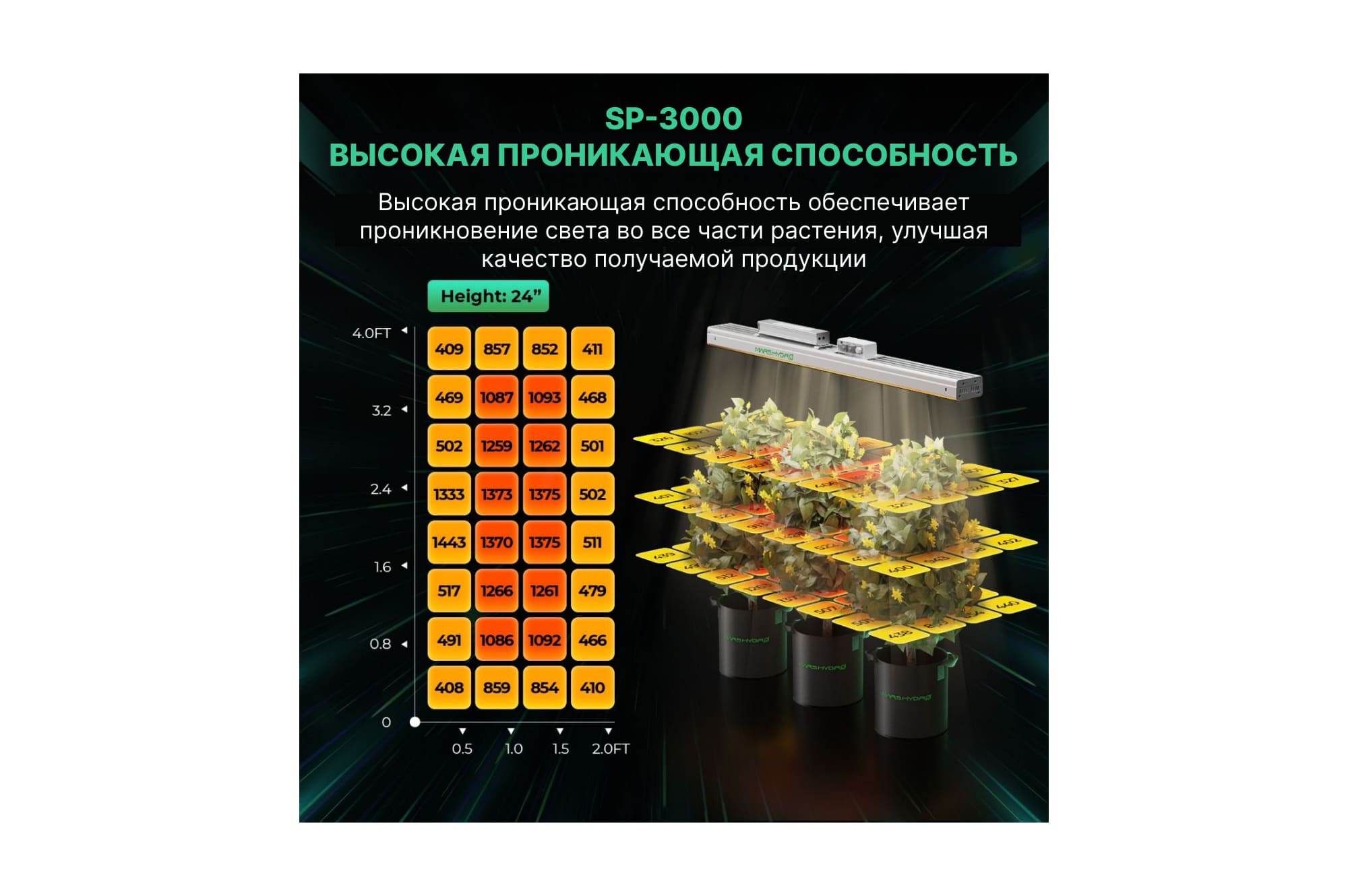 • способно глубоко проникать сквозь растительную массу и обеспечивать активный фотосинтез растениям при любой высоте и раскидистости вегетативной части.