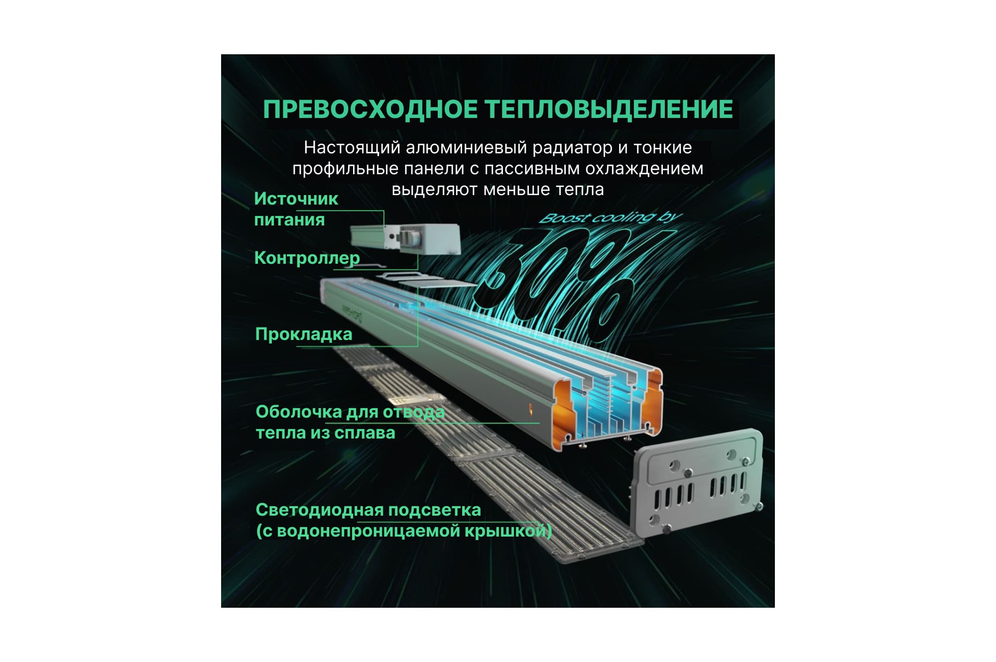 Линейный светодиодный фитосветильник. Обеспечивает интенсивный рост и активное цветение. Легко моделируется в модульные комплексные системы освещения и может использоваться в промышленном растениеводстве и в гровинге для досветки или создания полного светового дня при выращивании рассады и любых лиственных и цветущих культур.