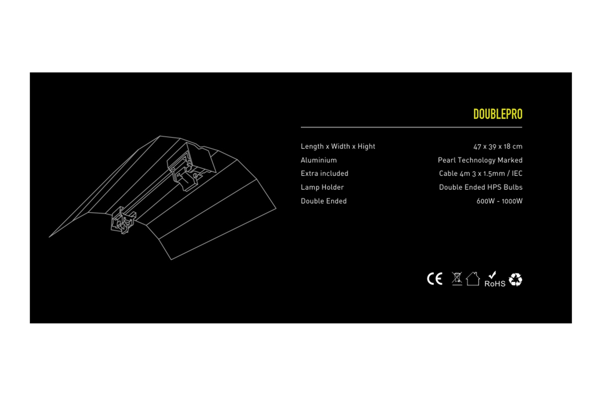 Данный светильник является бюджетным вариантом отражателя открытого типа для ламп Double Ended. Double Pro выполнен из светотехнического алюминия, что даёт этому светильнику легкость и максимальное светоотражение (98 %). Особое строение «крыльев» образуют бипараболическую форму, увеличивая тем самым площадь освещения, по сравнению с аналогами, а благодаря своей обтекаемой форме, светильник уменьшает количество «горячих» точек на освещаемой площади, что позволяет эффективно отводить тепло.