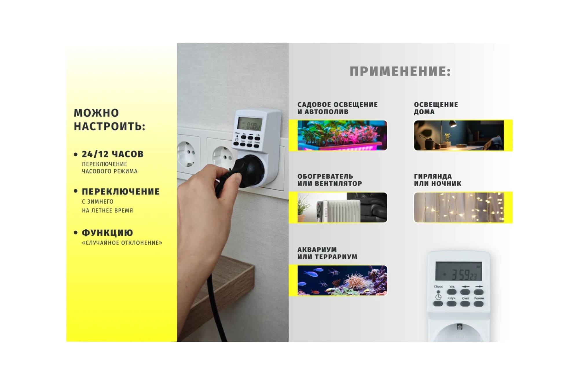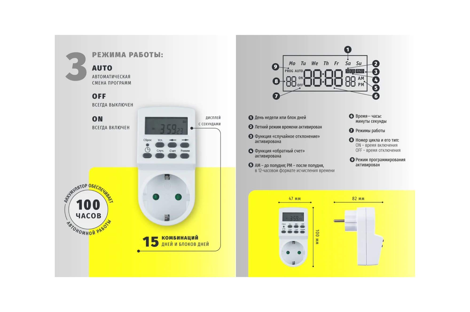 Благодаря наличию аккумулятора таймер продолжит работать на протяжении 100 часов при перебоях с электричеством.