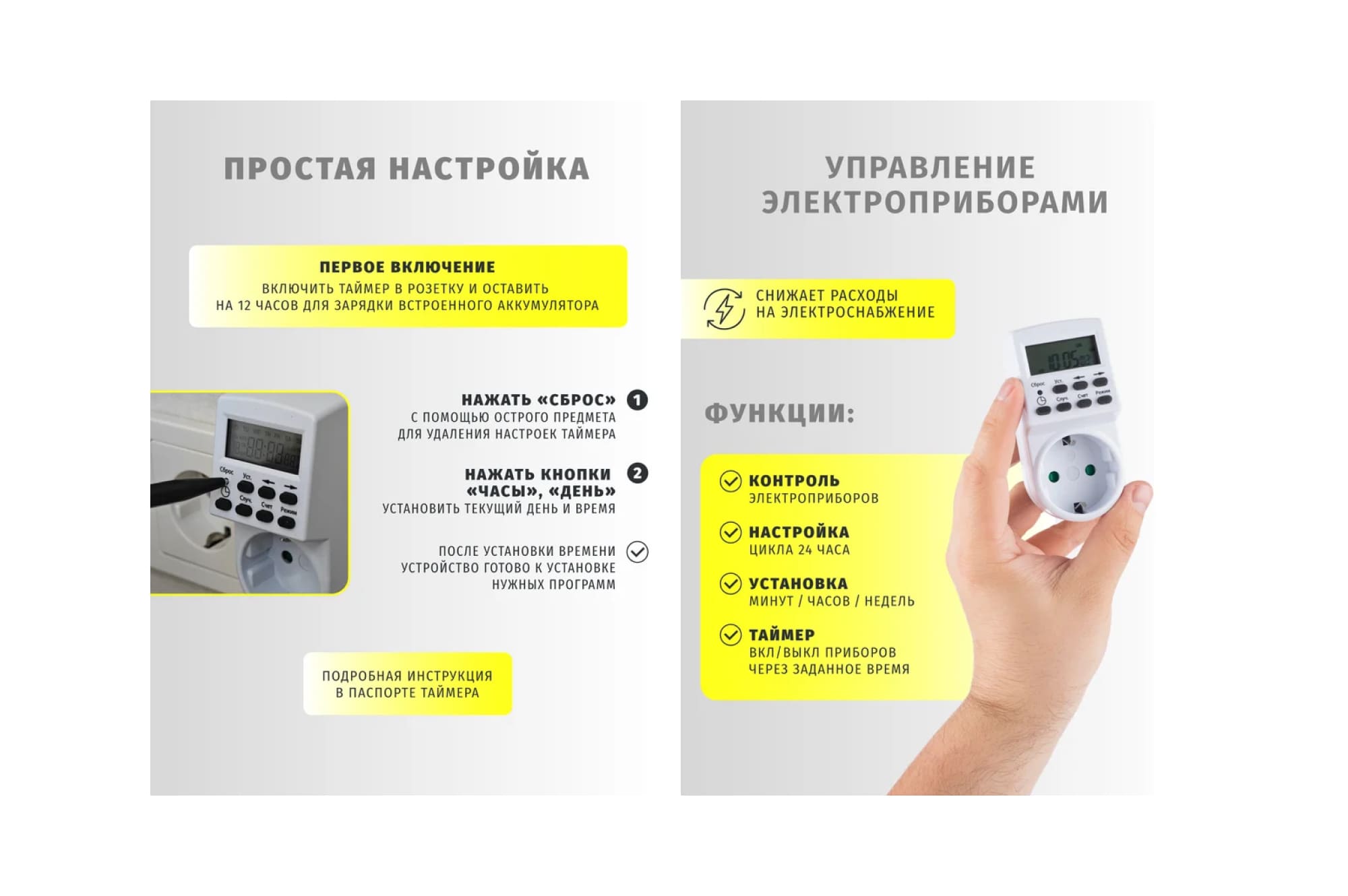 При первом включении таймер следует оставить в розетке для подзарядки на 12 часов, а затем произвести сброс имеющихся настроек с помощью кнопки «Сброс». После этого, зажав кнопку «Часы», с помощью кнопок «День», «Час» и «Мин», устанавливаются текущая дата и время. Далее можно переходить непосредственно к установке программ – для этого следует воспользоваться кнопкой «Таймер», которая запускает программирование. С помощью кнопки «Откл/выкл» можно временно отключать один или несколько циклов.