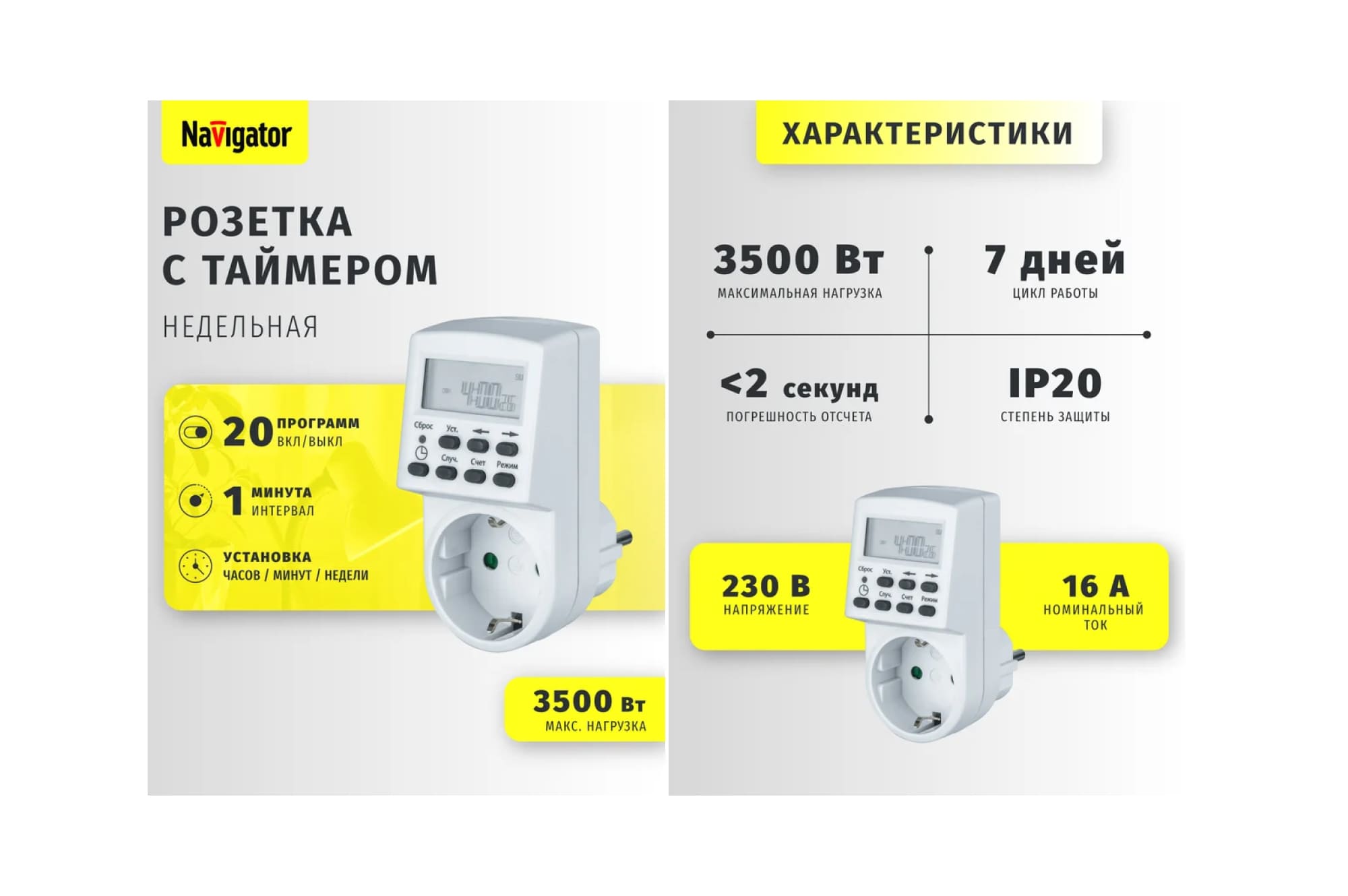 Таймер Navigator имеет недельный цикл работы. В его памяти можно сохранить до 20 программ включения и отключения с минимальным интервалом в 1 минуту. Устройство способно работать при температурном режиме от -10 до +40 С.
