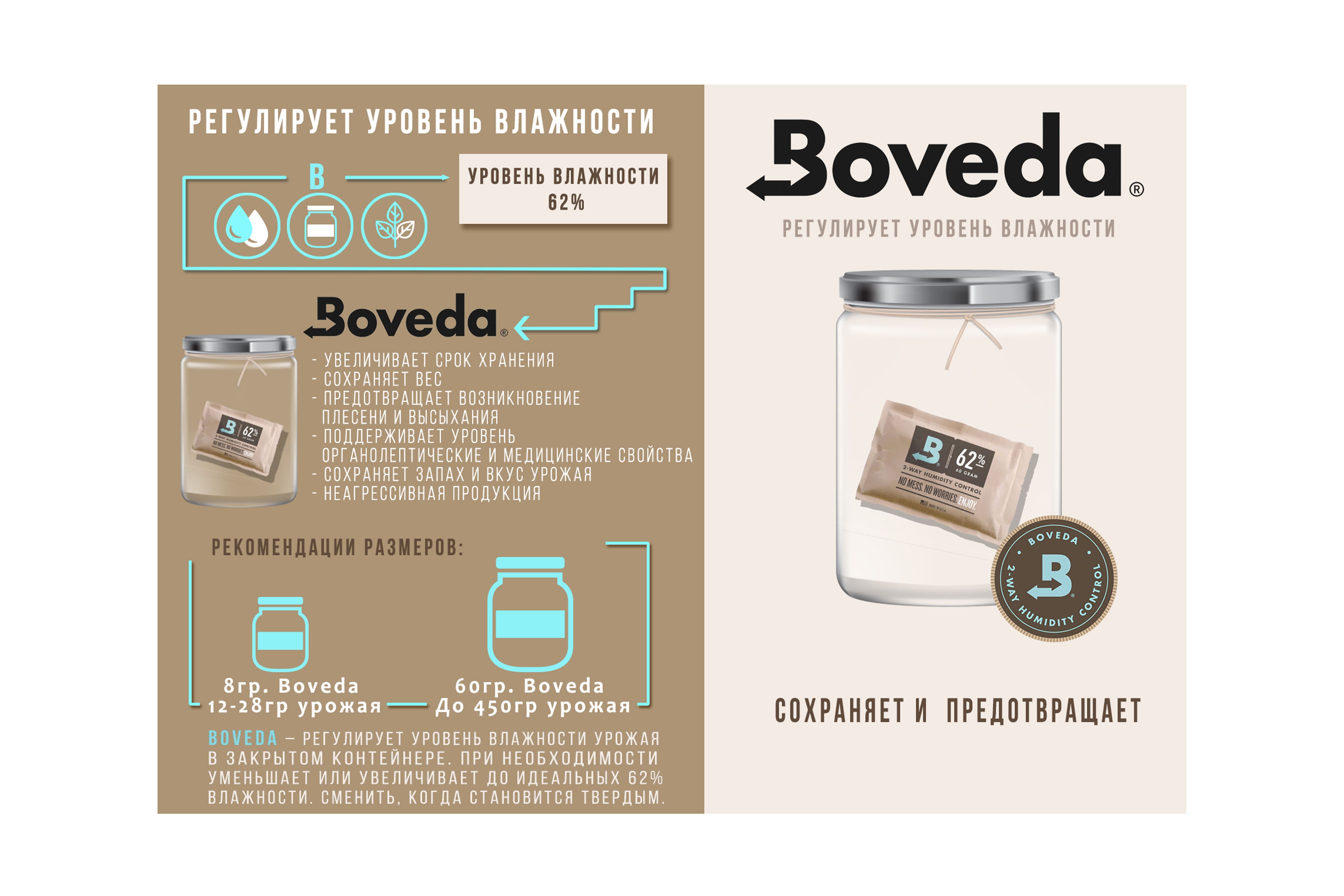 Boveda в пакетах по 8 г — средство американского производителя на основе неагрессивных натуральных компонентов, предназначенное для улучшения сохранности урожая. Обеспечивает идеальный для большинства растений (семян) уровень относительной влажности HR при хранении в закрытой таре — 62%. Если влажность ниже, препарат повышает ее, если выше нормы — стабилизирует.
