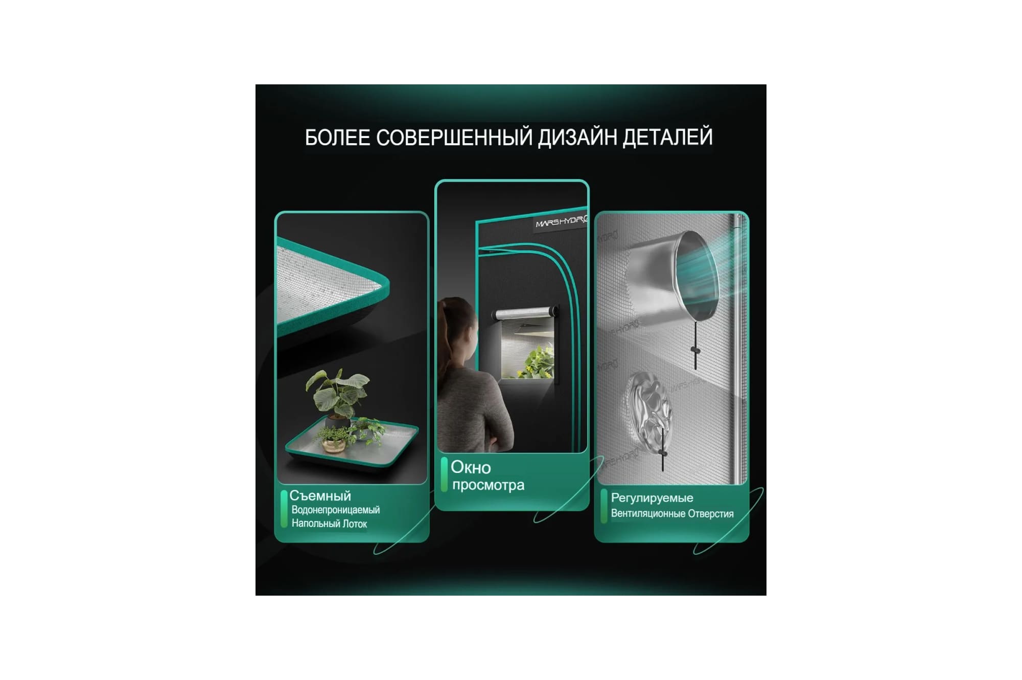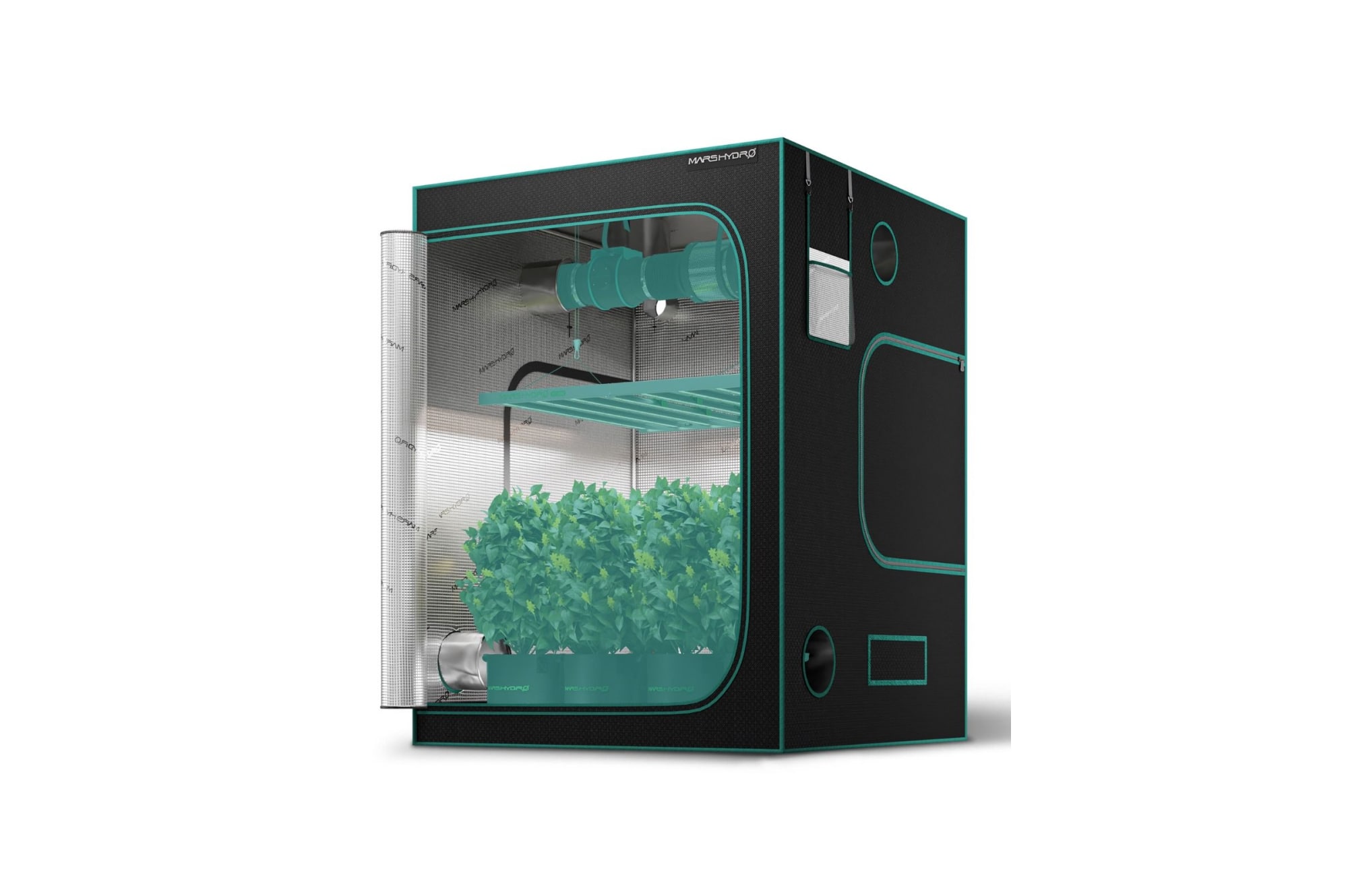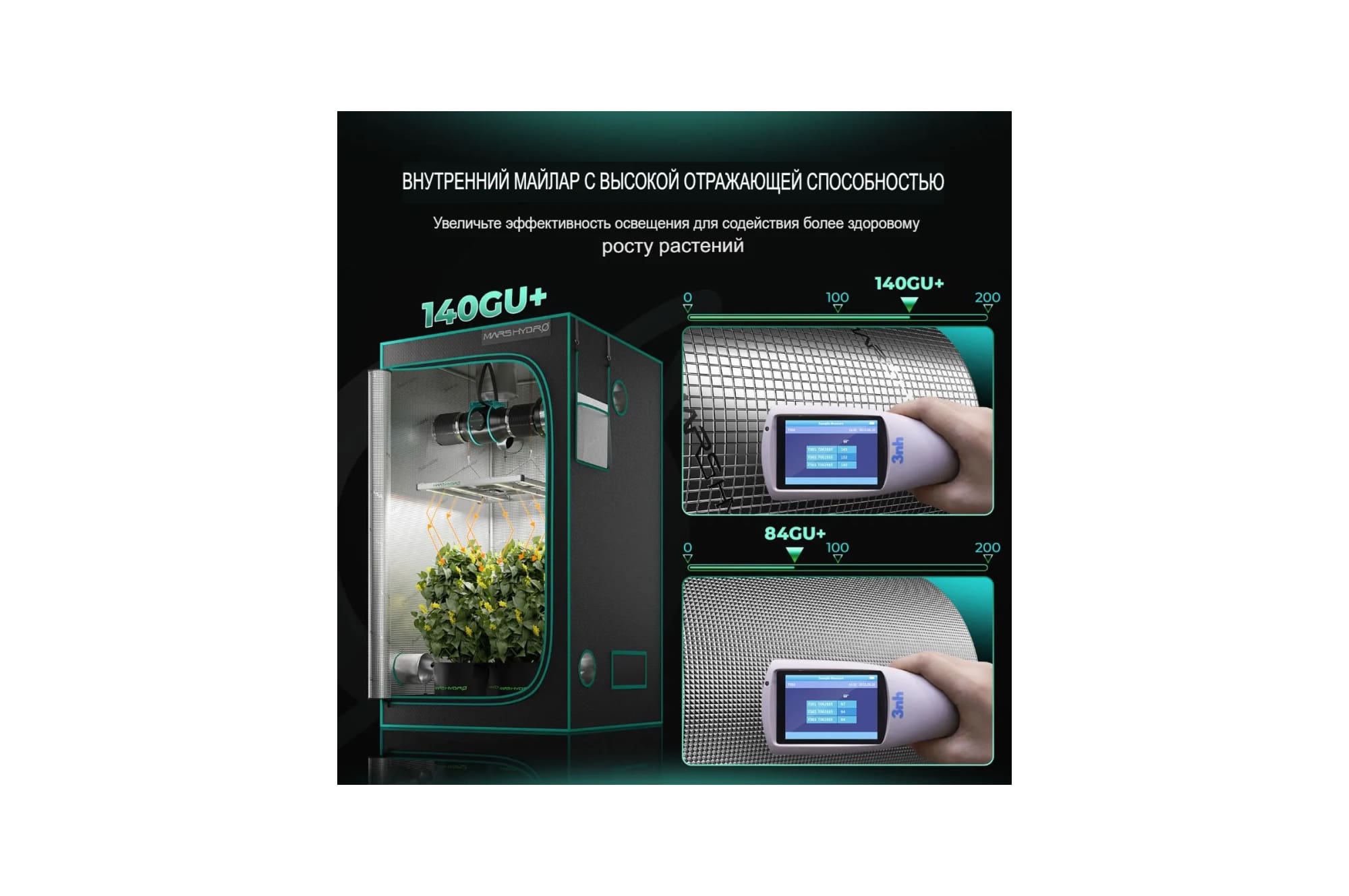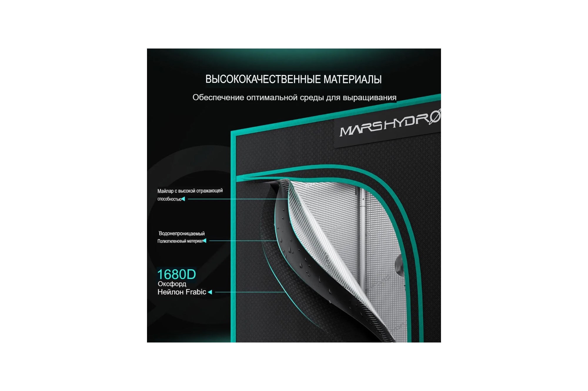 Корпус гроубокса изготовлен из прочного металлокаркаса с усиленными угловыми соединениями, способного выдерживать внушительные нагрузки — в том числе тяжелое световое и вентиляционное оборудование. Внутренняя поверхность обтянута светоотражающим майларом с коэффициентом отражения до 98%, что обеспечивает равномерное распределение света и максимальную эффективность его использования. Свет никуда не теряется — он работает на результат.