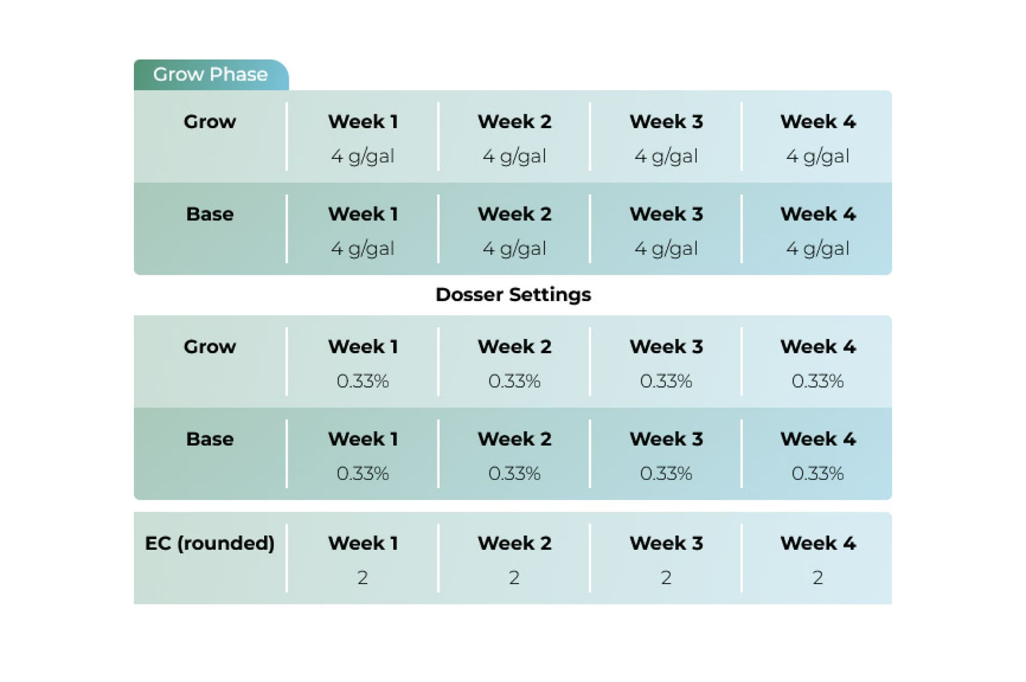 Для достижения наилучших результатов вегетативного роста растений, Cultivator Series - Grow используется в соответствии с рекомендуемыми дозировками: