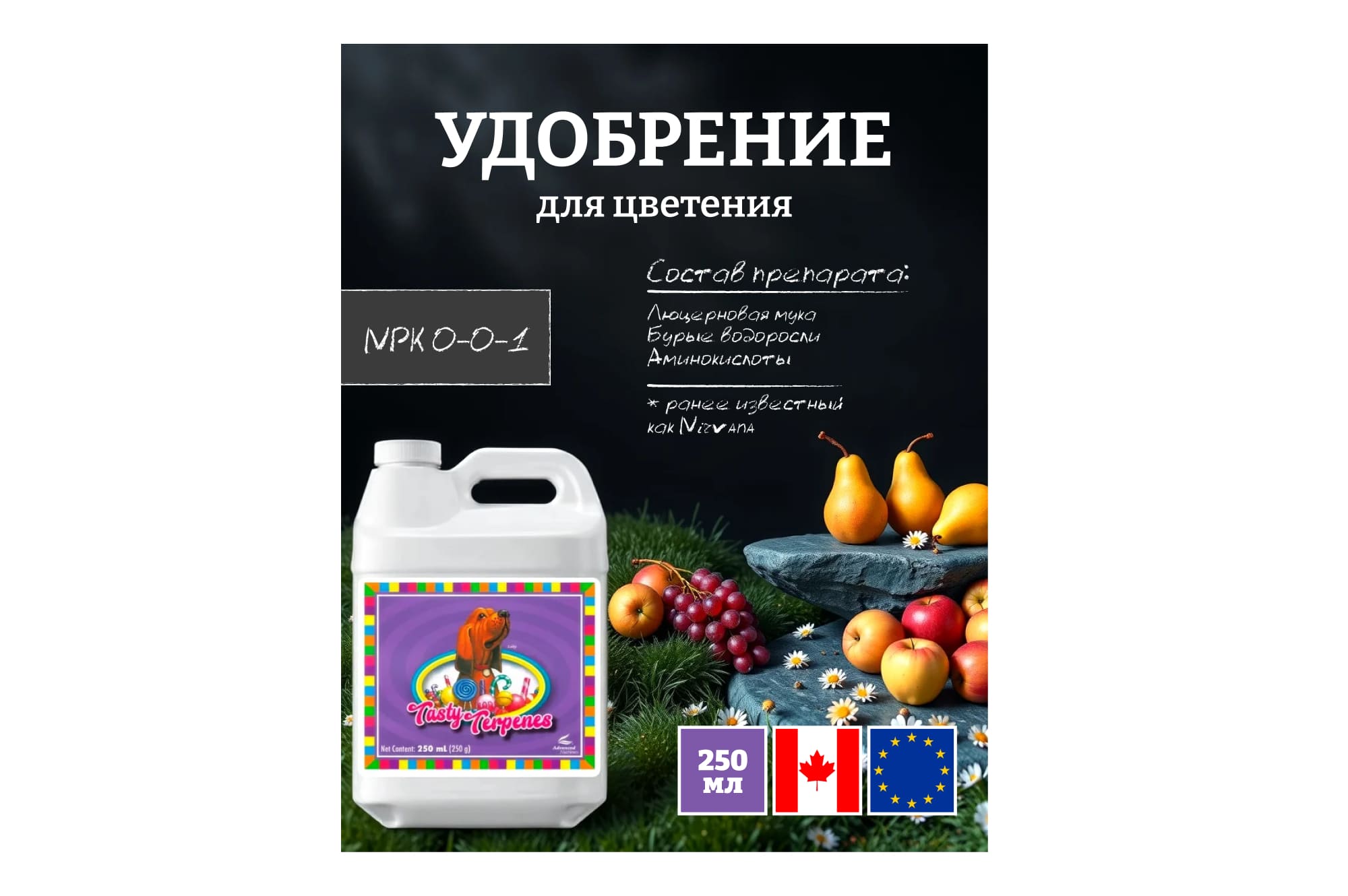 Advanced Nutrients Tasty Terpenes — биостимулирующее удобрение в жидкой форме, способствующее укреплению стеблей растительных культур, лучшему формированию соцветий, повышению урожайности. В состав Advanced Nutrients Tasty Terpenes входят: Аминокислоты. Укрепляют растения, способствуют развитию плодов; Люцерна, водоросли (бурые). Обеспечивают растения широким спектром витаминов, что положительно сказывается на показателях урожайности Калий и иные минеральные вещества, способствующие здоровому развитию растений и пышному цветению. Совокупность влияния вышеназванных элементов в том числе увеличивает способность растений к фотосинтезу (что крайне важно для их развития), повышает их устойчивость к различным заболеваниям. Advanced Nutrients Tasty Terpenes даёт возможность выращивать в условиях гидропоники плоды, не уступающие по вкусовым качествам и аромату культурам, произрастающим в естественных условиях. Совместим со всеми видами удобрений. Применяется на 3-7 неделях цветения, в концентрации 2 мл средства на 1 л. воды. Хранят Advanced Nutrients Tasty Terpenes в соответствии с указанными в инструкции по применению условиями, в недоступных для детей и животных местах.