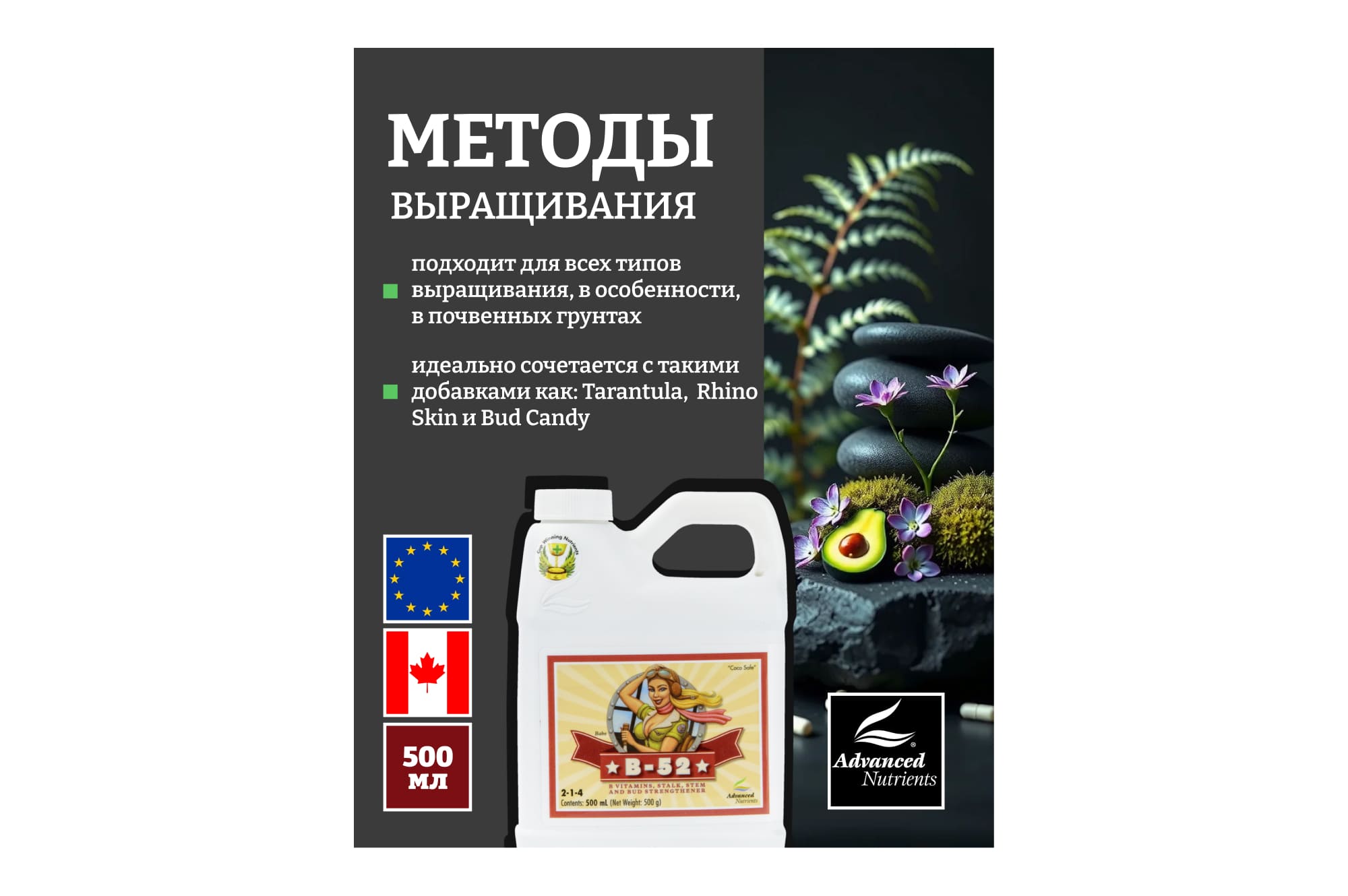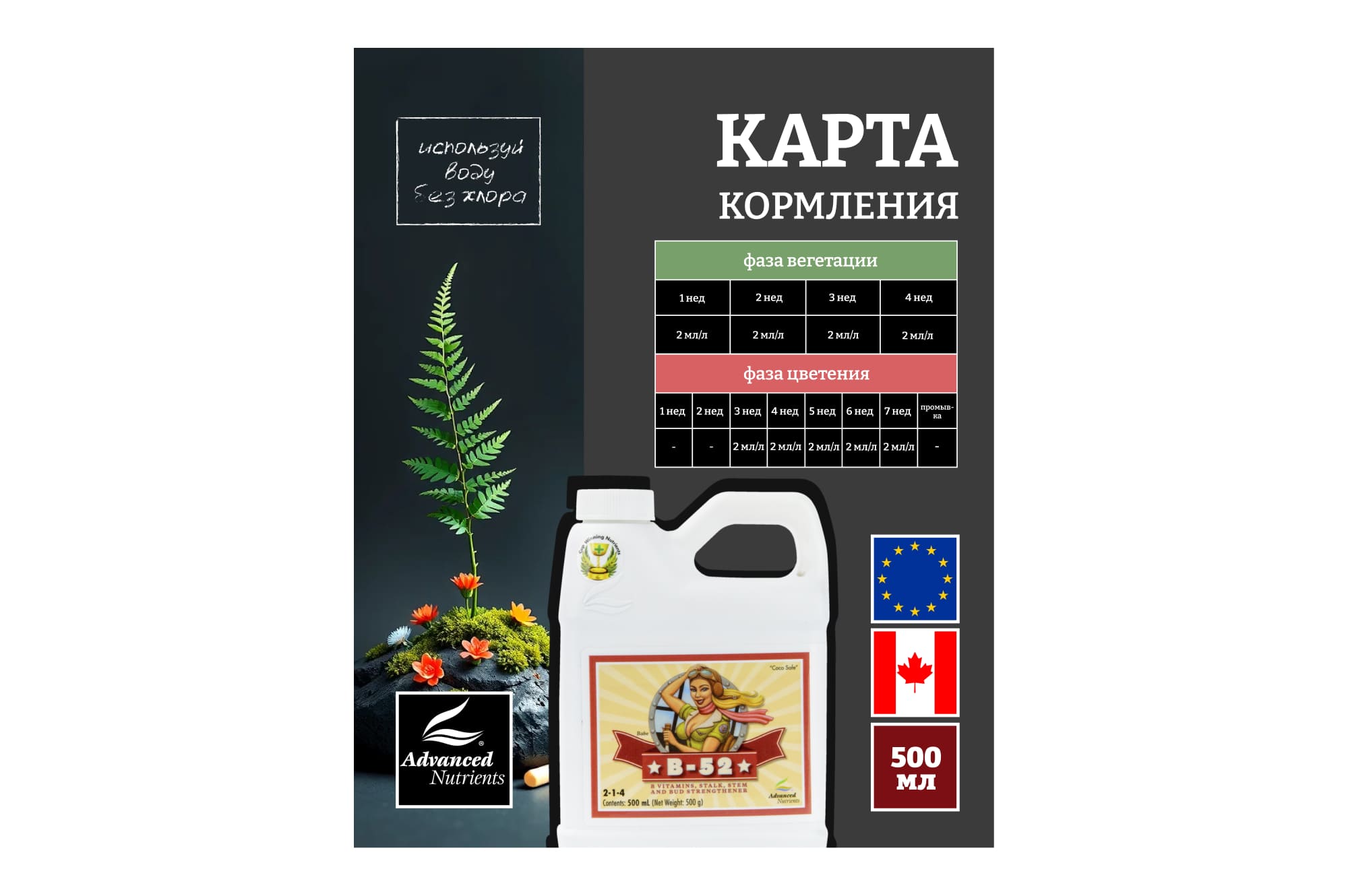 Применяют как дополнительное питание корневой системы и опрыскивают сельскохозяйственные культуры. Витамин В-52 используют в течение вегетативной стадии, а также на стадии цветения путем добавления 2 мл/литр.