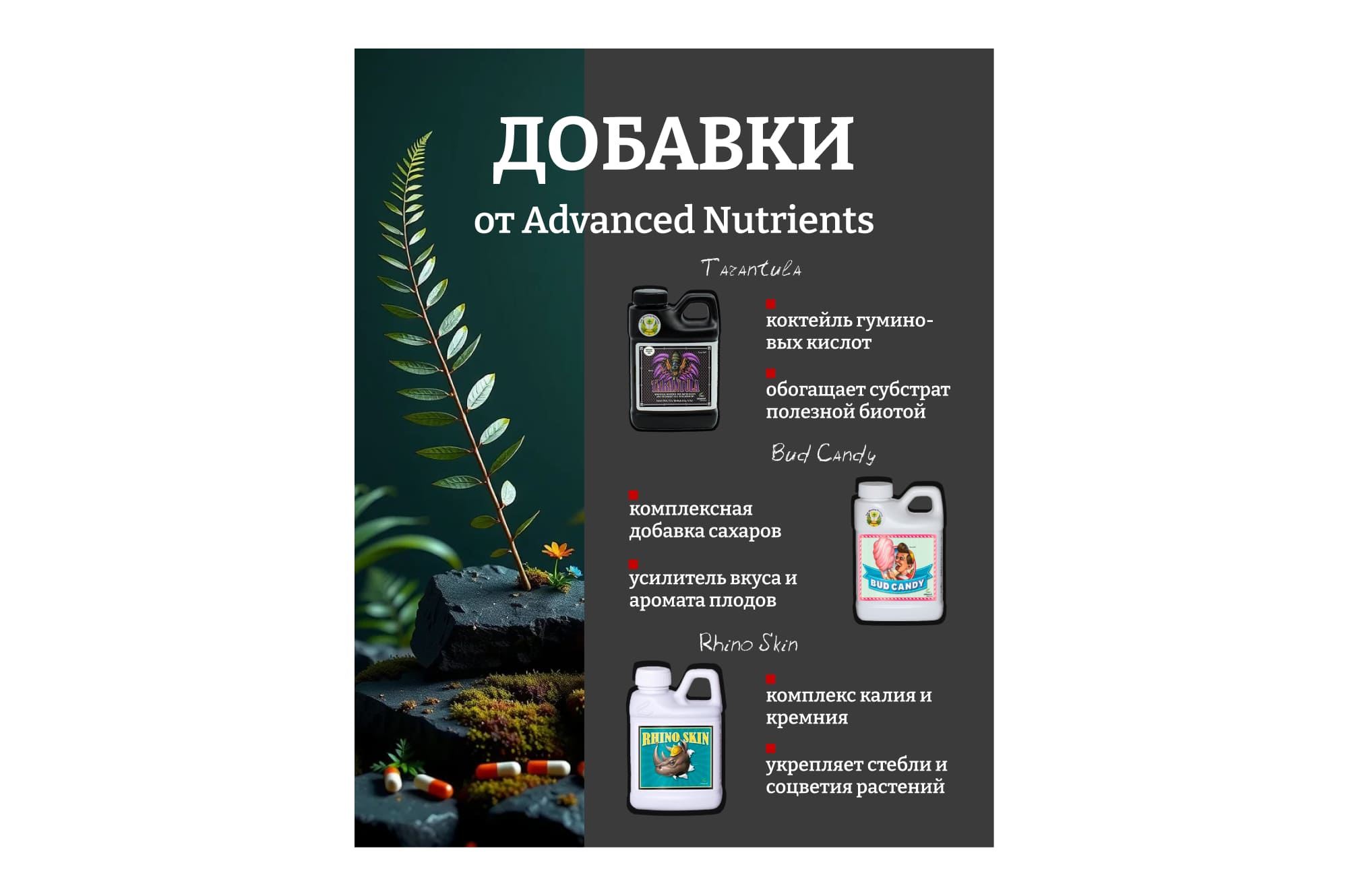 Витаминно-энергетический коктейль применяют в любой среде выращивания: для гидропоники, в почве, во мхе, в водоемах и в качестве дополнительного прикорма. Добавку можно использовать на протяжении всего развития растений, начиная с высадки семян и до получения урожая.