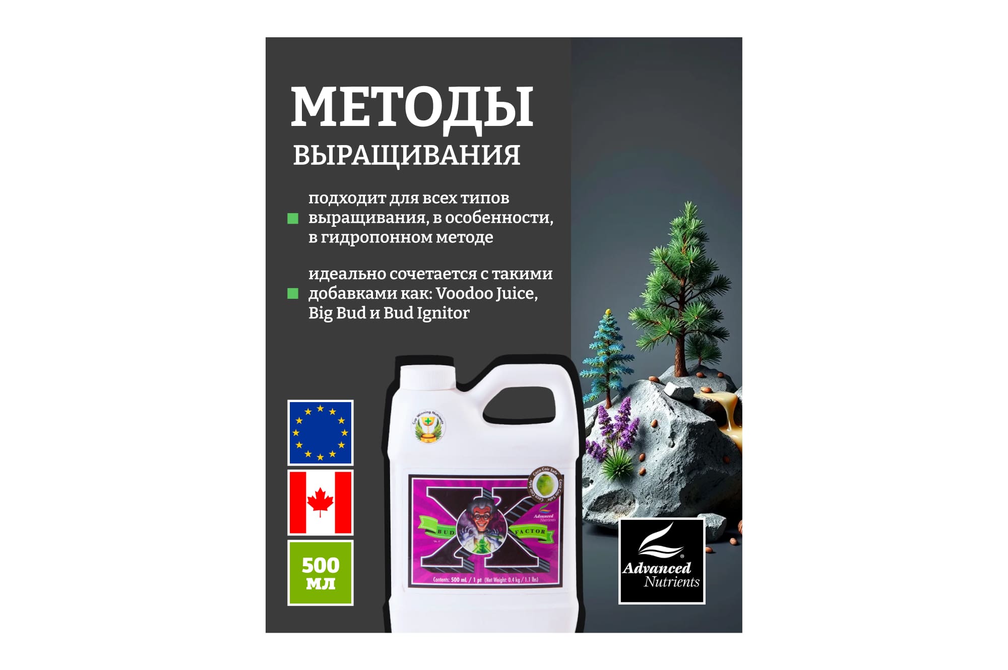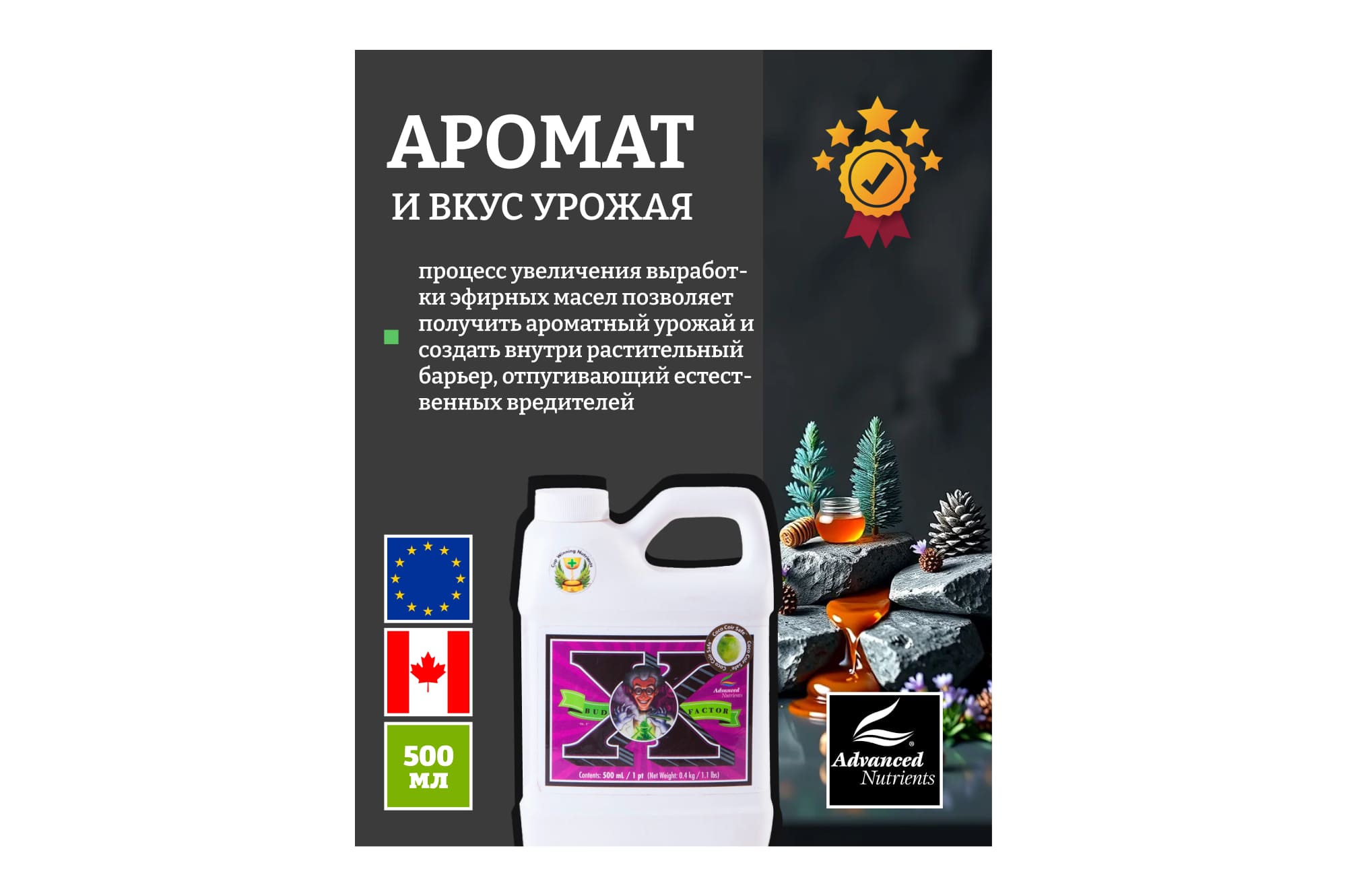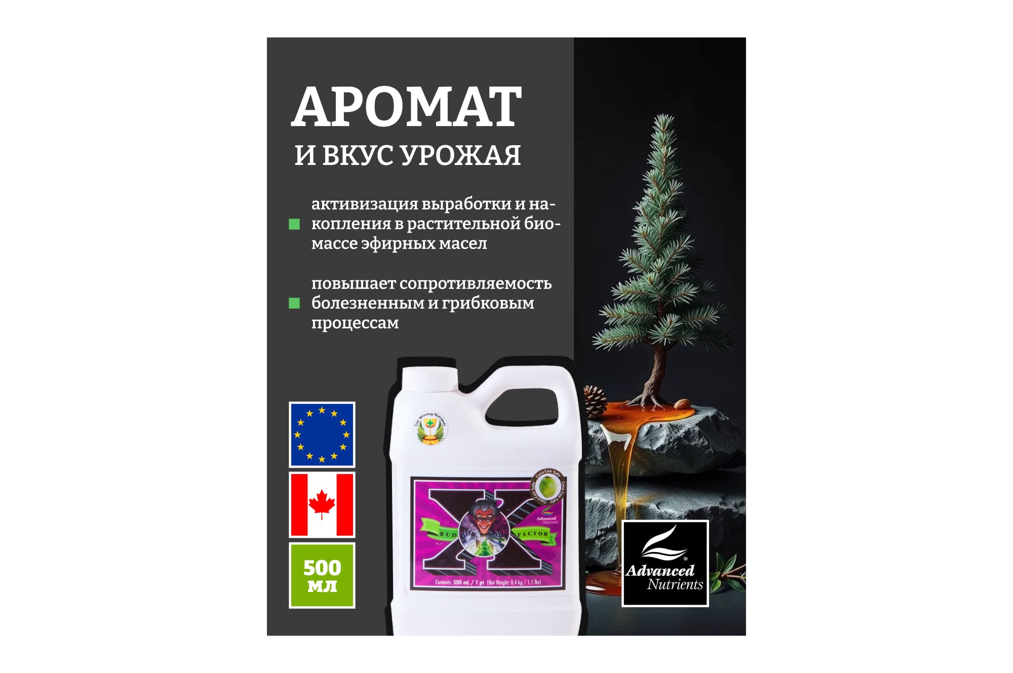 Это биохимический концентрированный стимулятор, активизирующий естественное выделение терпенов, определяющих количественные и качественные показатели выработки эфирных масел, цветения, формирования плодов и общего роста растений.