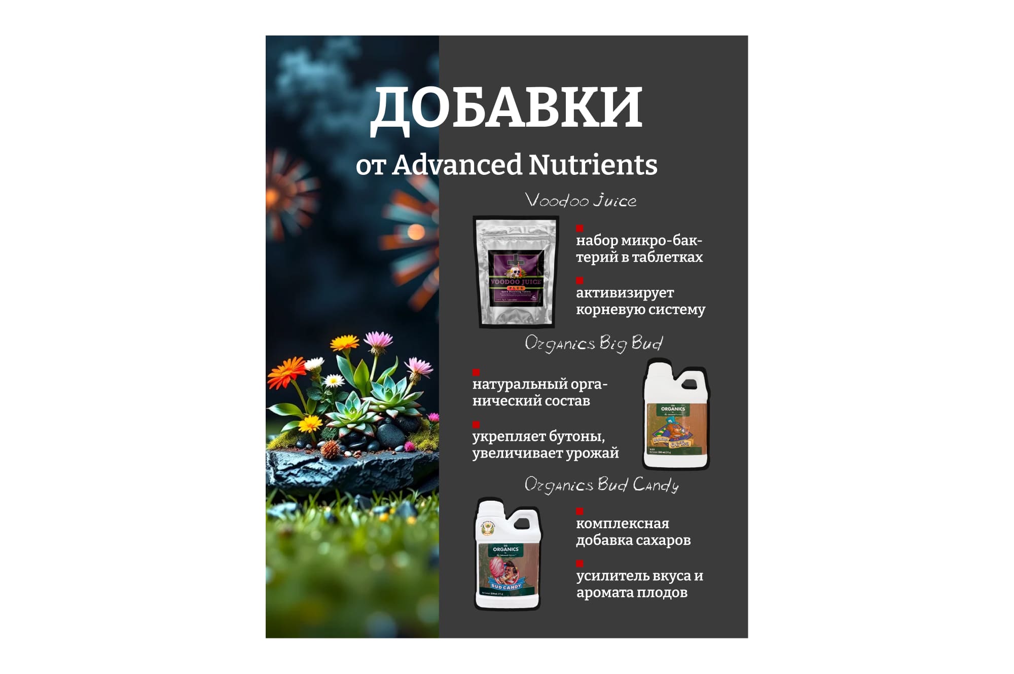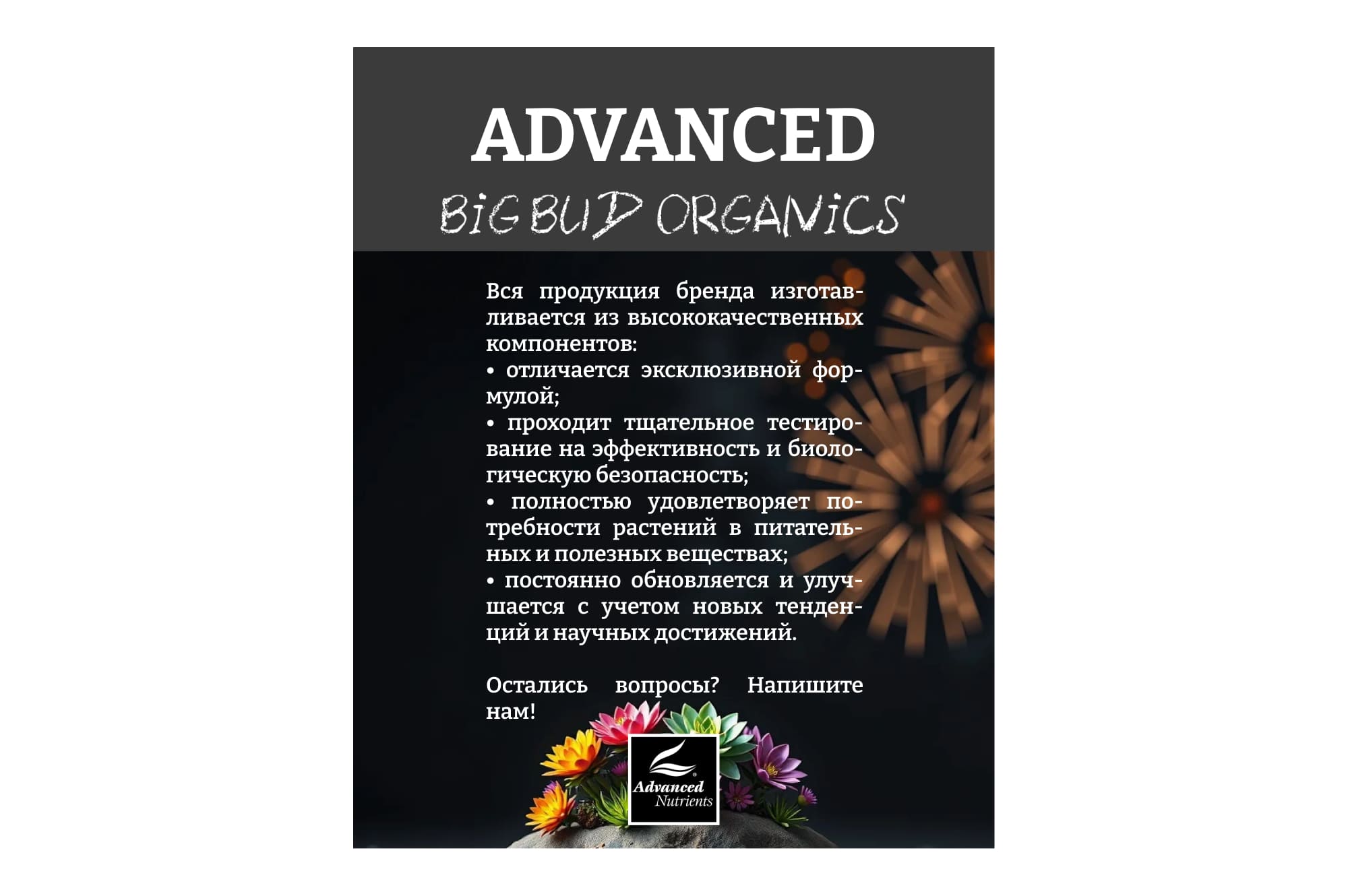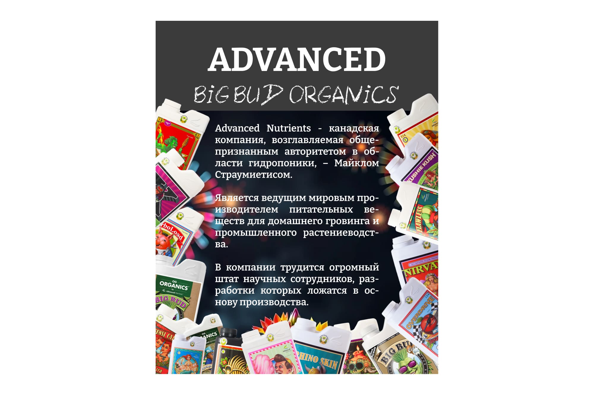 ПРИМЕЧАНИЕ: В Advanced Nutrients не используется паклобутразол, даминозид или любые другие запрещенные регуляторы роста растений.