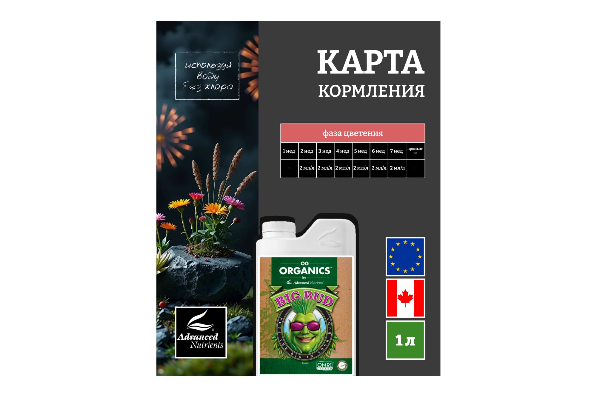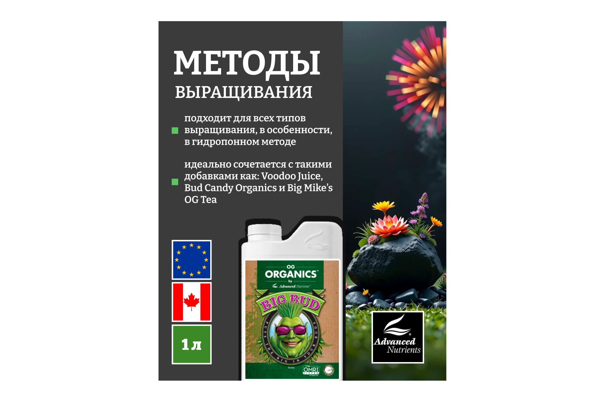 ВНИМАНИЕ: OG Organics™ Big Bud® полностью совместим со всеми базовыми питательными веществами pH Perfect, а также со всеми базовыми питательными веществами и добавками, отличными от pH Perfect, и со всеми базовыми питательными веществами и добавками конкурентов.