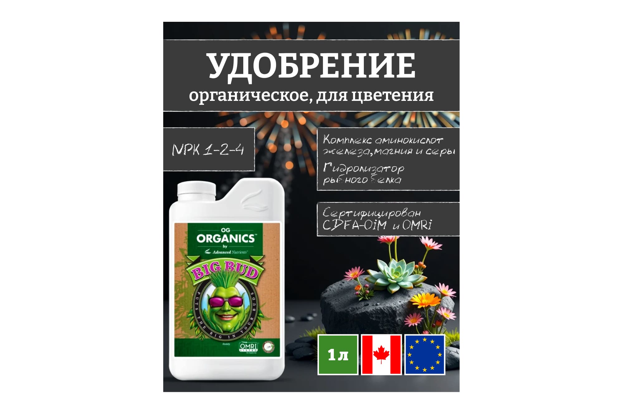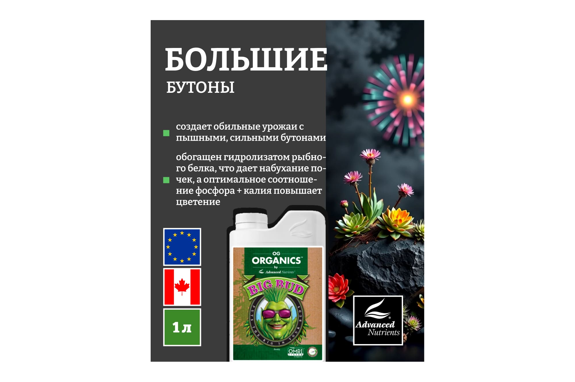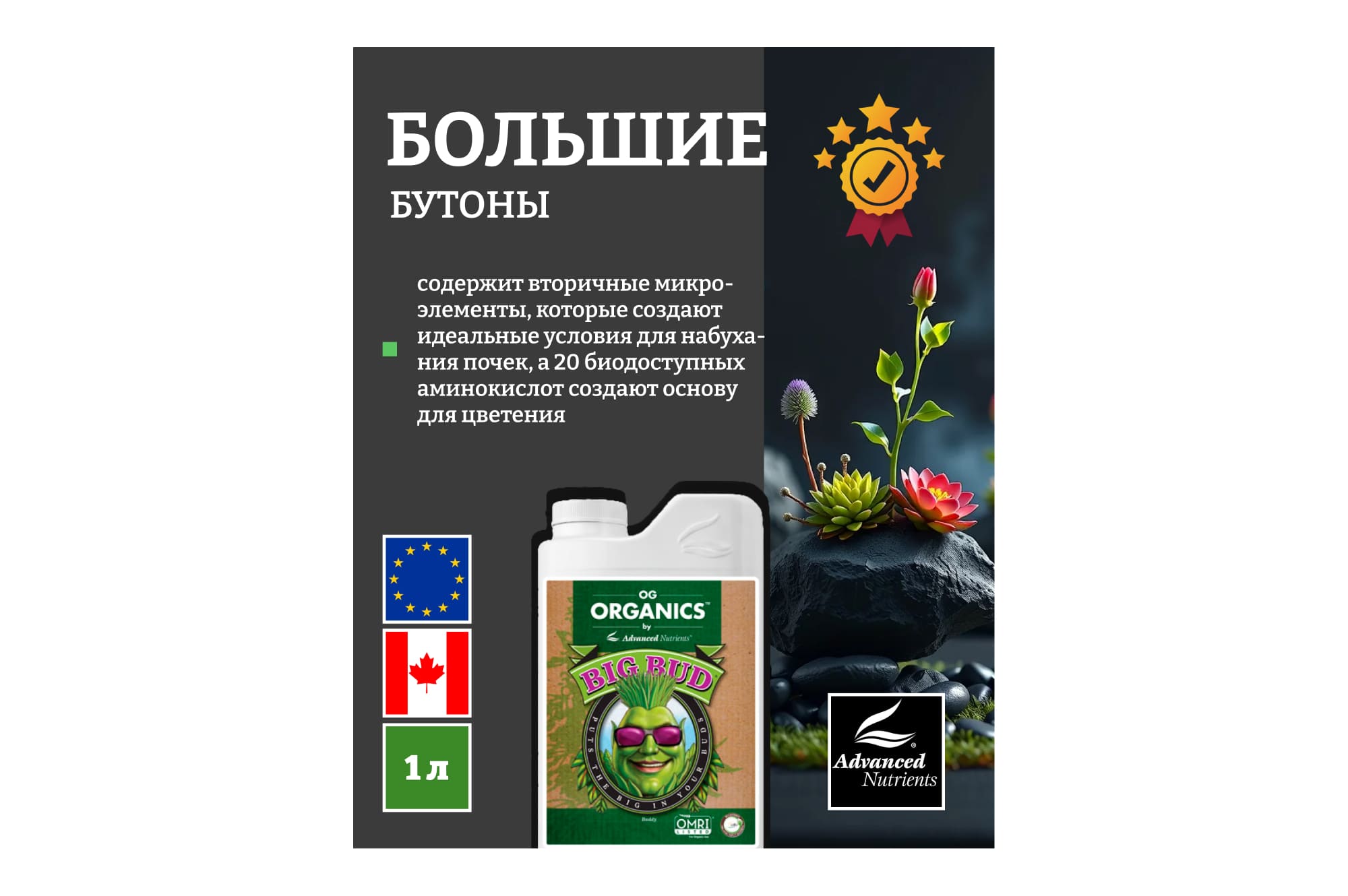 Содержит вторичные микроэлементы, которые создают идеальные условия для набухания почек, а 20 биодоступных аминокислот создают основу для цветения.