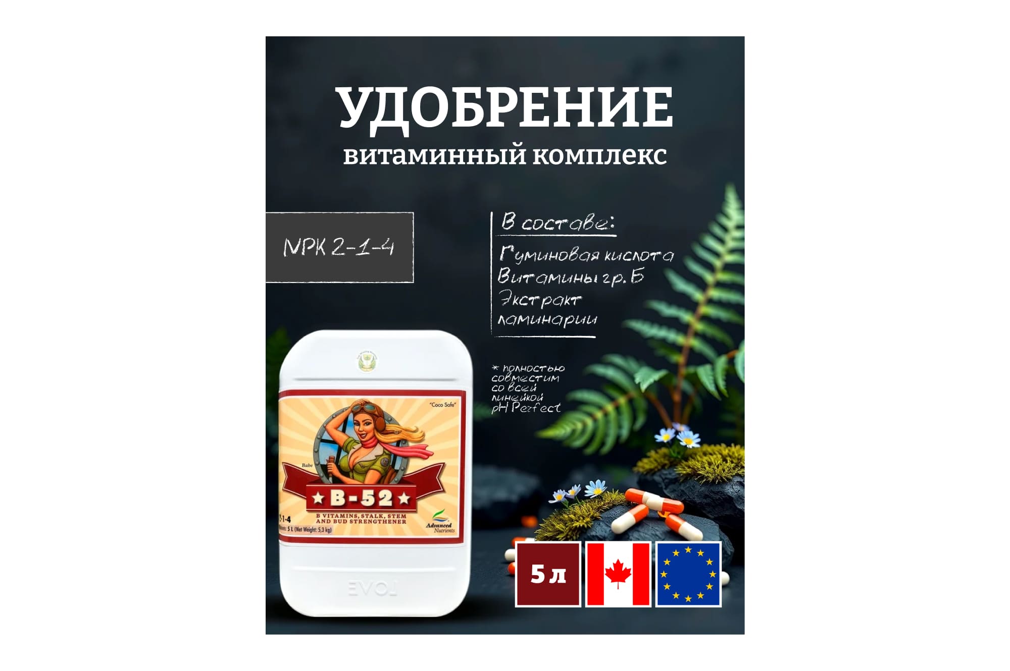 B-52 – органический стимулятор от компании Advanced Nutrients. Его называют витаминным коктейлем для растений, в состав входят нитрат кальция, фосфат магния, сульфат калия, нитрат калия, фосфат калия, гидрохлорид тиамина, гуминовая кислота, а также экстракт морских водорослей.