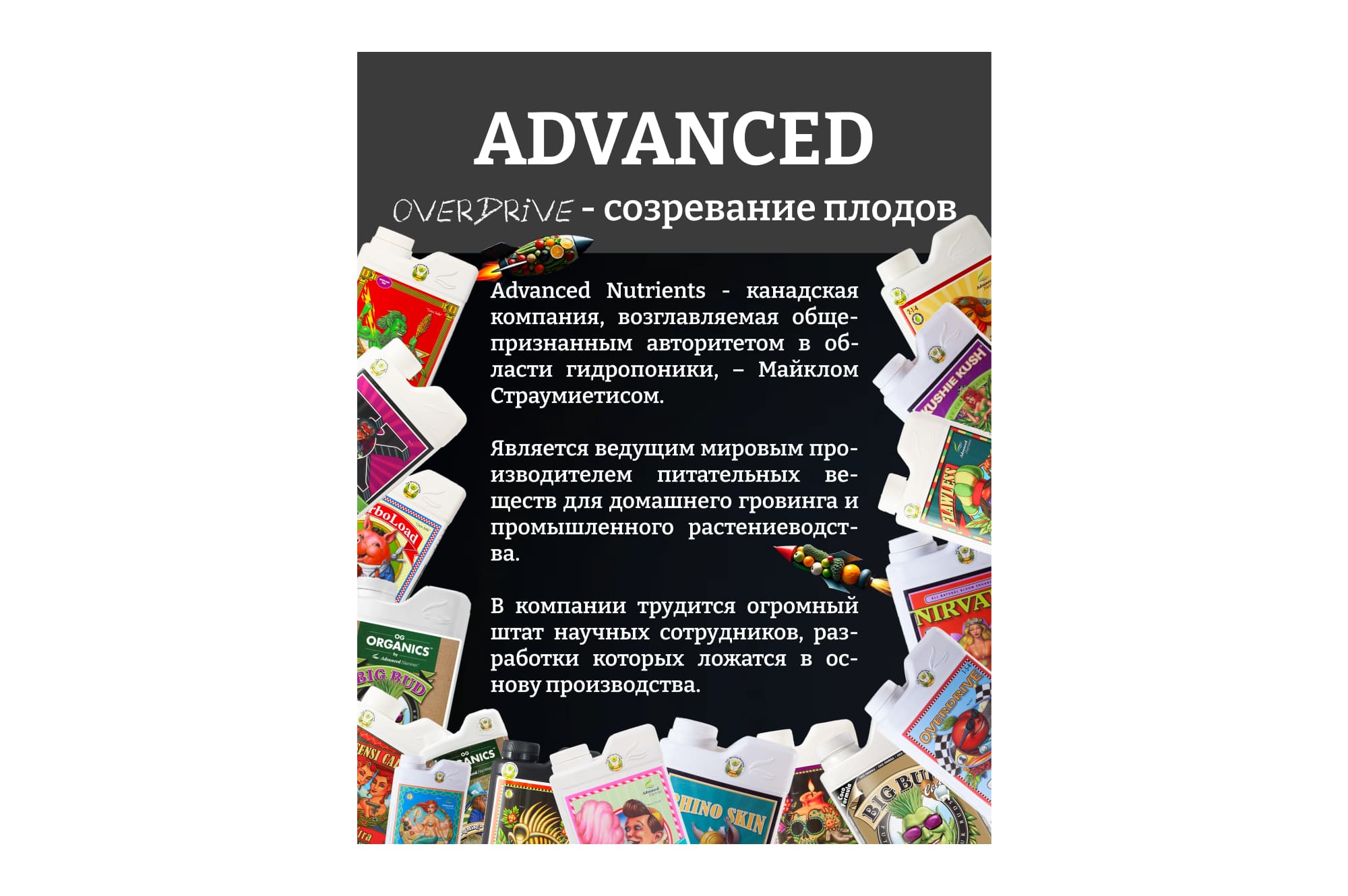 Канадская компания специализируется на разработке и выпуске удобрений, а также стимуляторов роста и цветения. Продукция компании пользуется огромным спросом по всему миру и имеет множество международных наград. Кроме того, статьи об эффективности удобрений и бустеров компании часто публикуются в крупнейших специализированных журналах по гидропонике.