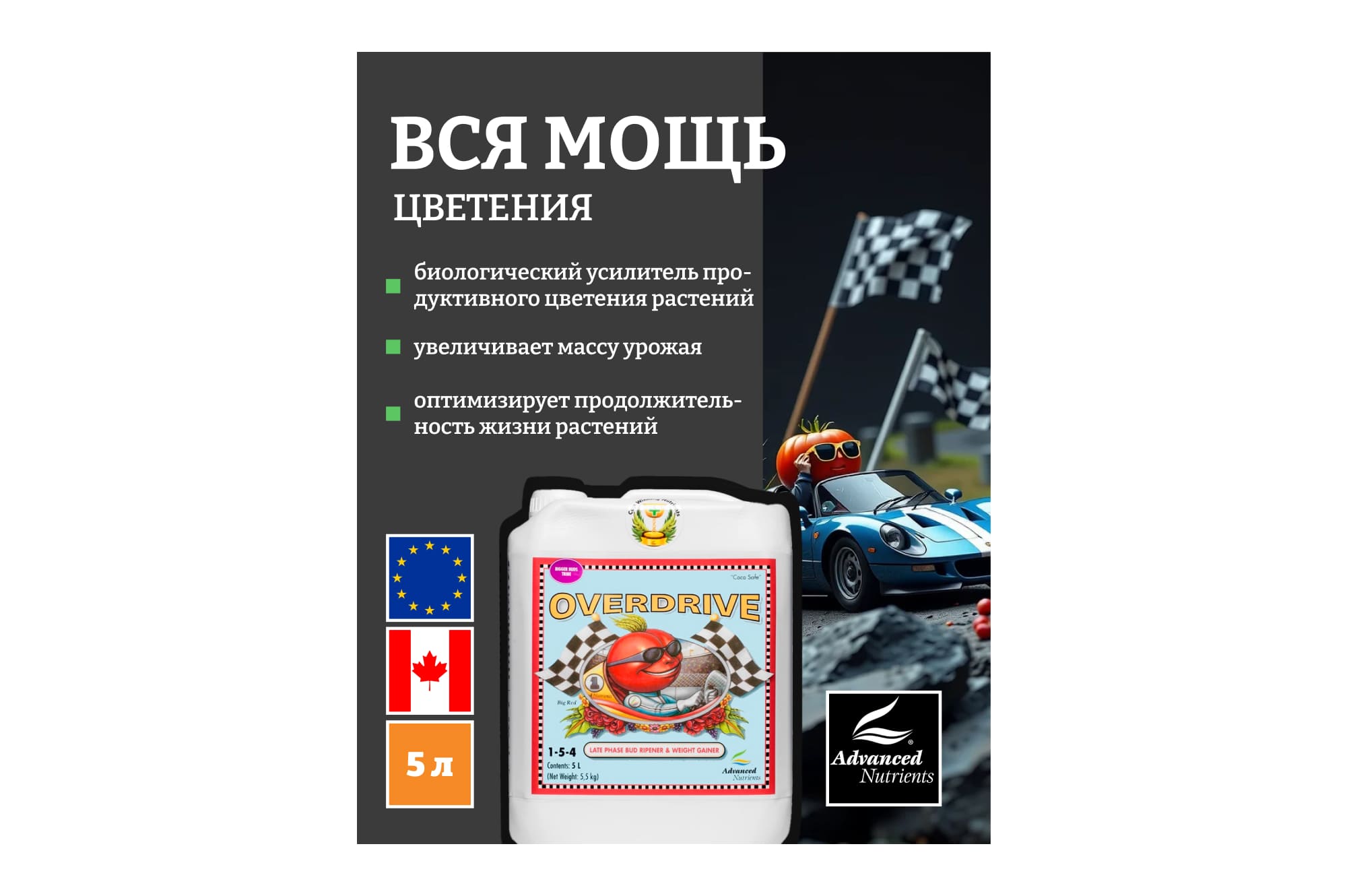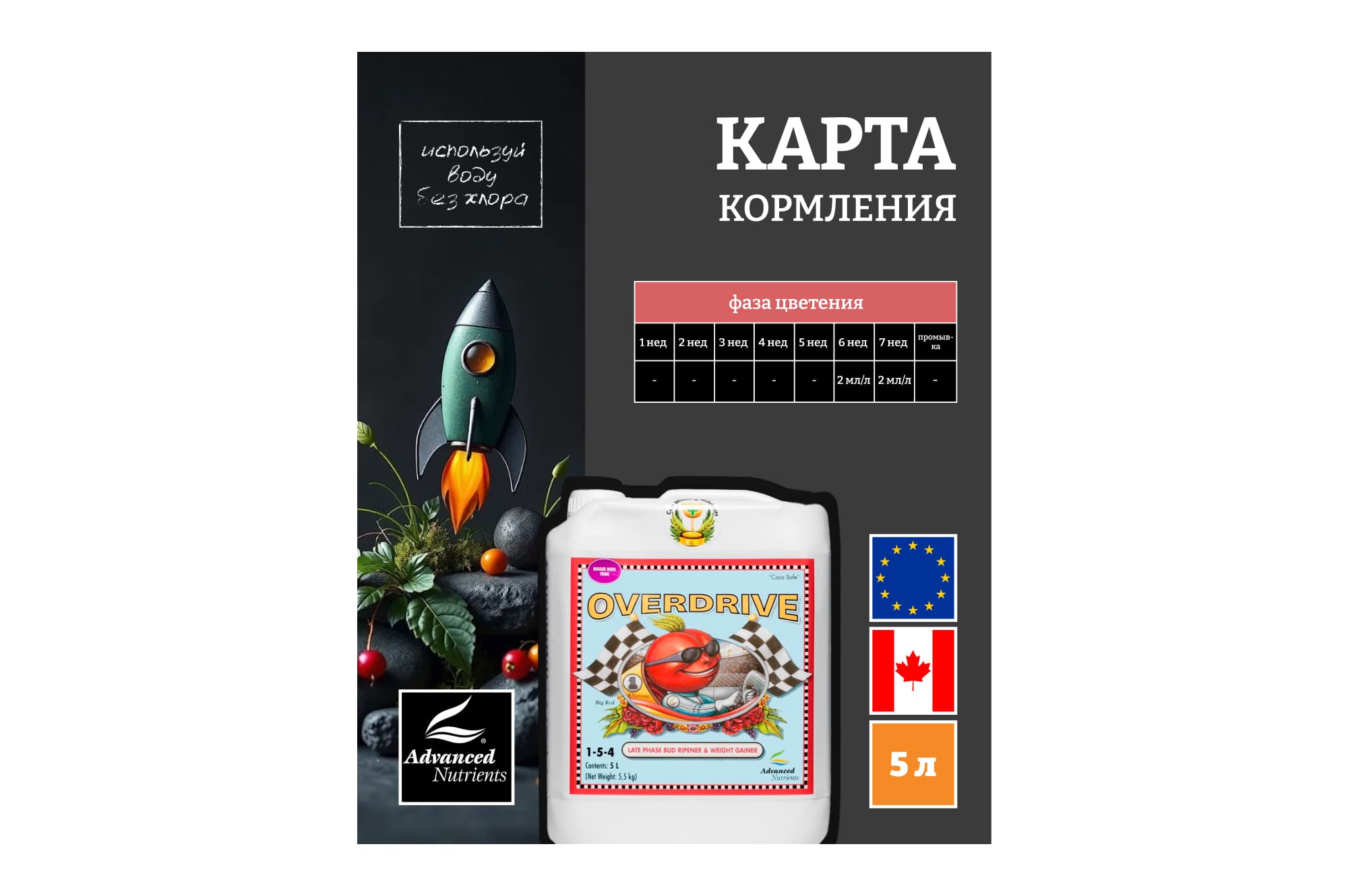 Продукт является высокоэффективным усилителем цветения и предназначен для использования на самых поздних стадиях цветения растений.