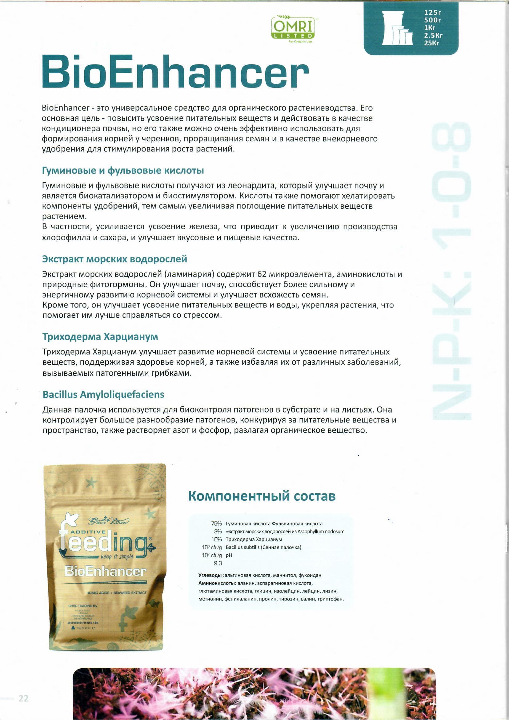 Добавка, созданная специально для биологических удобрений. В состав Enhancer входят гуминовые кислоты, зеленая плесень (trihoderma harzianum), сенная палочка (Bacillus subtilis) и экстракта водорослей. Enhancer увеличивает поглощение питательных веществ и улучшают качество почвы, что в свою очередь стимулирует развитие корневой системы и развитие почвенной микрофлоры.