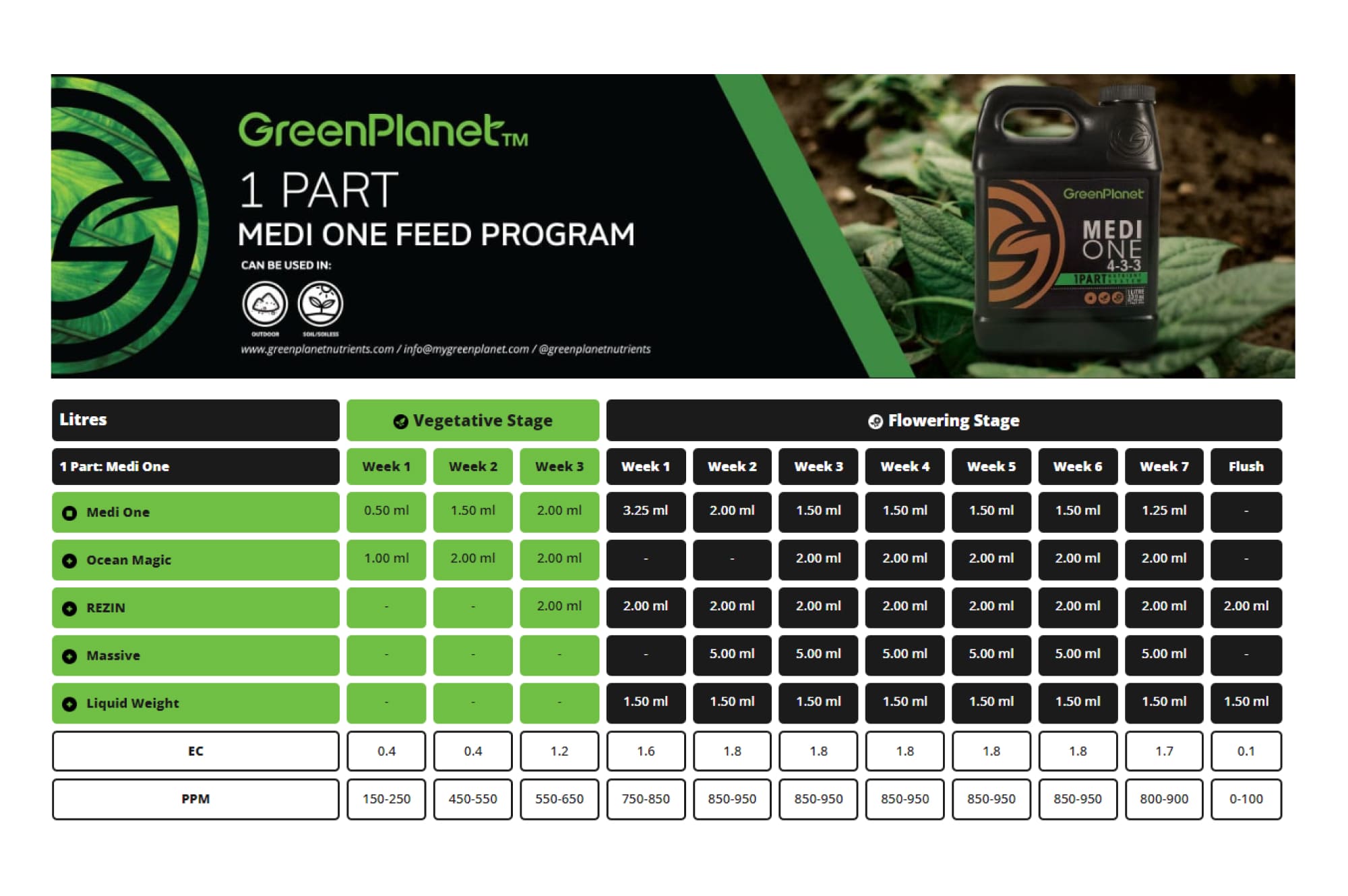 Для достижения наилучших результатов следует придерживаться программы питания Medi One, которая предусматривает точное применение каждого продукта на различных этапах жизненного цикла растения.