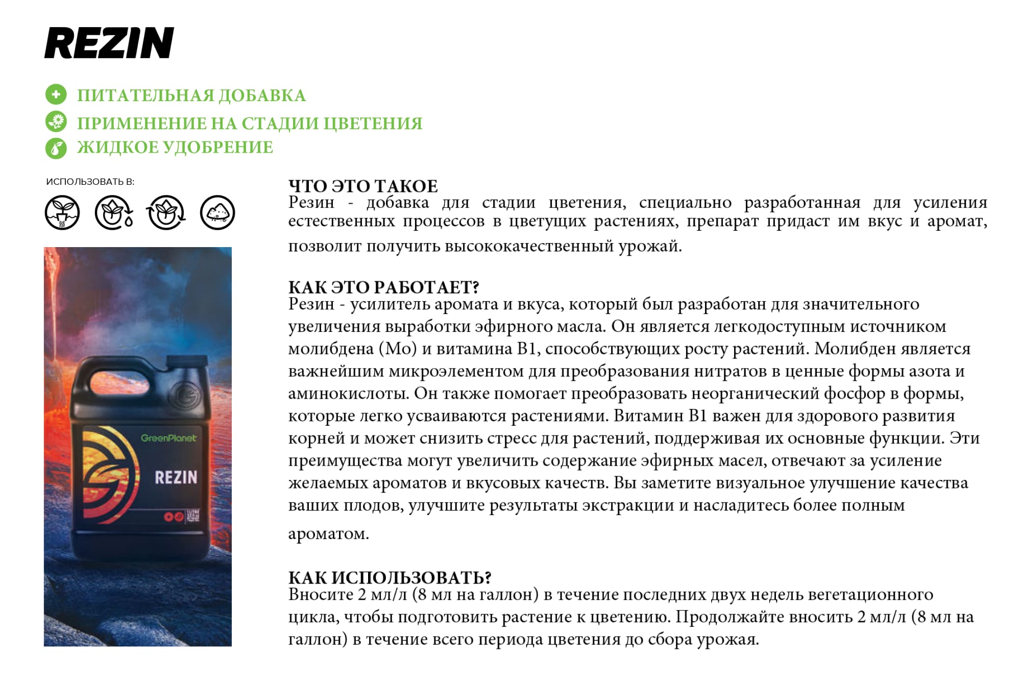 Rezin не оказывает влияния на ppm/EC питательного раствора, что позволяет сохранить неизменным химический состав и использовать основные питательные вещества без ограничений. Продукт не содержит PGR и других запрещенных компонентов. Усилитель способствует значительному увеличению выработки эфирных масел и ароматов в растениях, что улучшает качество и внешний вид цветков.