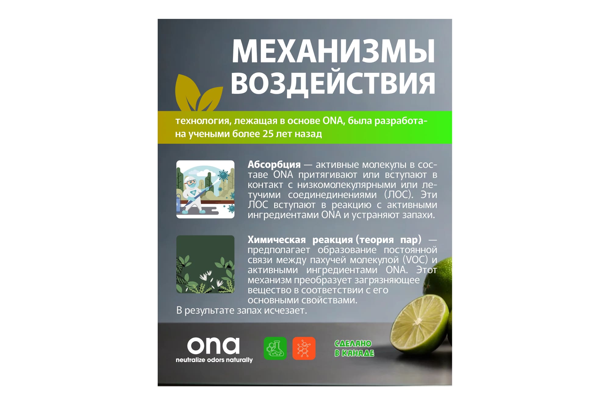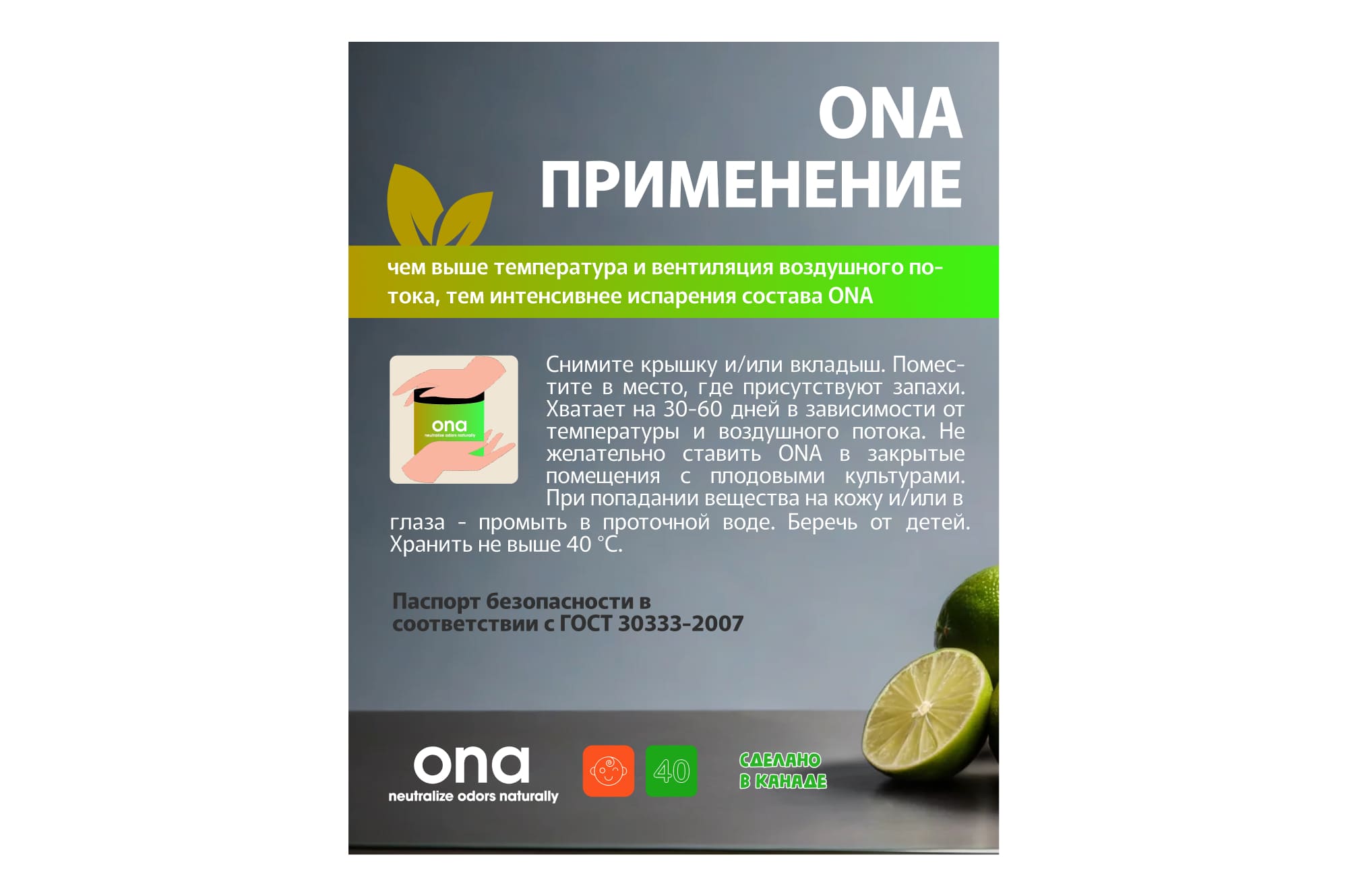 Состав геля включает эфирные масла из растений, что делает его полностью безопасным и натуральным для применения в условиях, где важно поддержание органической чистоты среды. Гель не просто маскирует запахи, но активно взаимодействует с ними на молекулярном уровне, что позволяет эффективно их нейтрализовать.