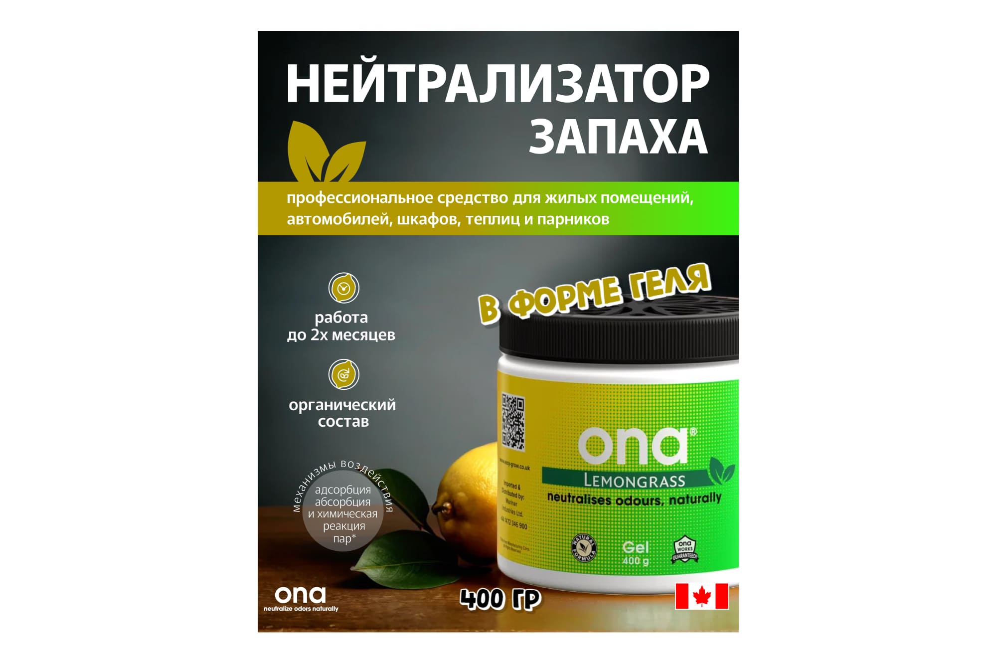 ONA Gel Lemongrass 0.5 л представляет собой высокоэффективный нейтрализатор запахов, разработанный для использования в областях растениеводства, таких как гидропонные установки и теплицы, где необходимо контролировать распространение органических запахов.