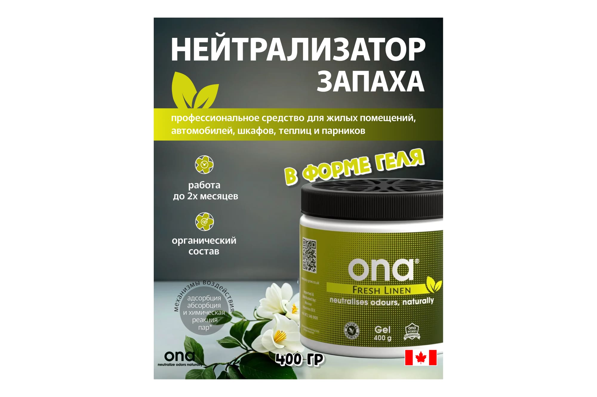 Принцип действия ONA Gel заключается в том, что средство борется с летучими веществами, нейтрализуя запах на молекулярном уровне. В гроубокс можно поставить банку с гелем, предварительно сняв защитную пленку. Можно нанести его на любую пластиковую поверхность или выложить в емкость с широким дном, усиливая тем самым эффективность нейтрализации запахов. Специалисты по домашнему растениеводству рекомендуют нанести гель прямо на вентилятор.