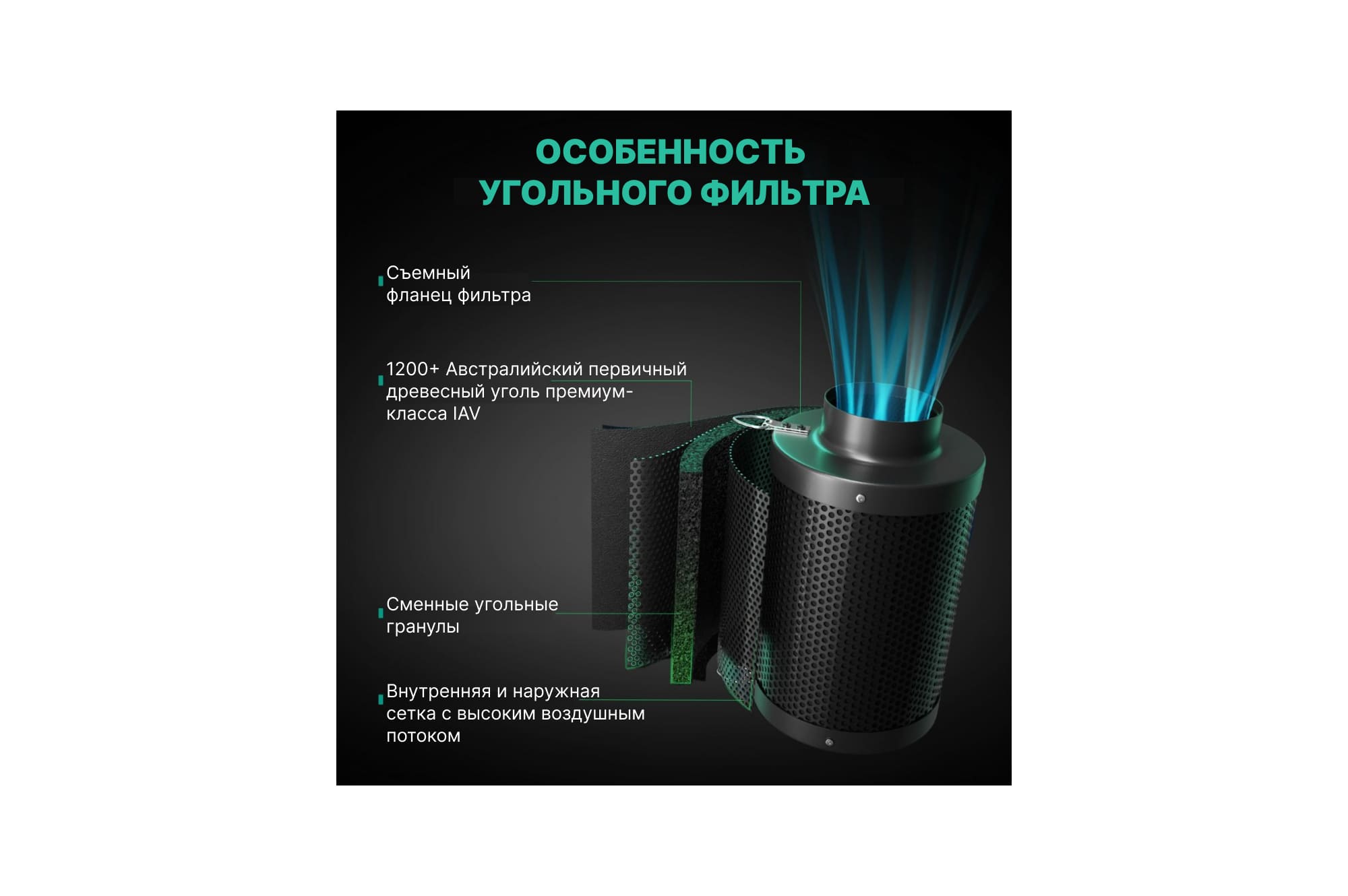 Фильтр оснащен активированным углем нового поколения с показателем 1050+ (сорт угля импортирован из Австралии), который обеспечивает 100%-ное удаление запахов и примесей из воздуха. Благодаря уникальной структуре, фильтр значительно улучшает циркуляцию воздуха и абсорбирует все нежелательные загрязняющие вещества, создавая для ваших растений чистую и безопасную среду. Это особенно важно при выращивании в закрытых помещениях, где хорошая вентиляция играет ключевую роль.